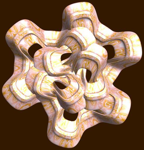 Keywords: mathematica 3d cg parametricplot3d texture torus 輪環 りんかん ドーナツ どーなつ 四芒星 しぼうせい 四光星 しこうせい 四稜星 しりょうせい code program algorithm コード プログラム アルゴリズム geometric sculpture geometricsculpture shape geometry sculpture mapping テクスチャ マッピング 模様 もよう abstract 抽象 ちゅうしょう アブストラクト design pattern デザイン パターン graphic グラフィック グラフィクス structure 意匠 構造 symmetry 対称性 たいしょうせい シンメトリー 対称 たいしょう algorithm コード indoor black background surreal a = 4; (* center hole size of a torus *) b = 4; (* tetra-torus *) c = 2; (* distance from the center of rotation *) d = 3; (* number of torus *) h = 1; (* height of a torus *) SetOptions[ParametricPlot3D, PlotRange -> Full, Mesh -> None, Boxed -> False, Axes -> False, PlotPoints -> 400, ImageSize -> 3000, Background -> Darker[Orange, 0.8], PlotStyle -> Directive[Specularity[White, 30], Texture[Import["D:/tmp/861.jpg"]]], TextureCoordinateFunction -> ({#4, #5 2 Pi} &), Lighting -> "Neutral"]; f[v_] := Sin[2 Sin[Sin[Sin[v]]]]; g[v_] := Sum[Cos[(2 k - 1) v]/(2 k - 1), {k, 4}]; x = (a - g[t] - f[b s]) Cos[s + 3 Pi/(4 b)] + c; y = (a - g[t] - f[b s]) Sin[s + 3 Pi/(4 b)] + c; z = (a - Sin[t] - h f[b s]); rot = Table[{x, y, z}.RotationMatrix[2 i Pi/d, {0, 0, 1}], {i, d}]; ParametricPlot3D[rot, {t, 0, 2 Pi}, {s, 0, 2 Pi}] (*--- The Texture *) a = 4; (* center hole size of a torus *) b = 4; (* tetra-torus *) c = 2; (* distance from the center of rotation *) d = 3; (* number of torus *) h = 1; (* height of a torus *) SetOptions[ParametricPlot3D, PlotRange -> Full, Mesh -> None, Boxed -> False, Axes -> False, PlotPoints -> 400, ImageSize -> 3000, Background -> Darker[Orange, 0.8], PlotStyle -> Directive[Specularity[White, 30], Texture[Import["D:/tmp/861.jpg"]]], TextureCoordinateFunction -> ({#4, #5 2 Pi} &), Lighting -> "Neutral"]; f[v_] := Sin[2 Sin[Sin[Sin[v]]]]; g[v_] := Sum[Cos[(2 k - 1) v]/(2 k - 1), {k, 4}]; x = (a - g[t] - f[b s]) Cos[s + 3 Pi/(4 b)] + c; y = (a - g[t] - f[b s]) Sin[s + 3 Pi/(4 b)] + c; z = (a - Sin[t] - h f[b s]); rot = Table[{x, y, z}.RotationMatrix[2 i Pi/d, {0, 0, 1}], {i, d}]; ParametricPlot3D[rot, {t, 0, 2 Pi}, {s, 0, 2 Pi}] (*--- The Texture *) |