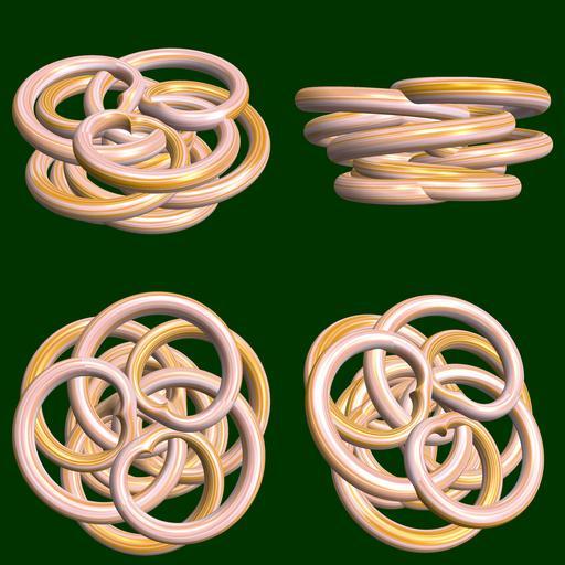 Keywords: mathematica 3d cg parametricplot3d texture torus 輪環 りんかん ドーナツ どーなつ 捩れ よじれ code program コード プログラム algorithm コード アルゴリズム geometric sculpture geometricsculpture shape geometry sculpture mapping テクスチャ マッピング 模様 もよう abstract 抽象 ちゅうしょう アブストラクト design pattern デザイン パターン graphic グラフィック グラフィクス structure 意匠 構造 symmetry 対称性 たいしょうせい シンメトリー 対称 たいしょう algorithm bright photo border black background organic pattern food wheel a = 5; (* center hole size of a torus *) b1 = 3; (* number of cross *) b2 = 4; (* number of cross *) c = 2; (* distance from the center of rotation *) d = 3; (* number of torus *) w = 4; (* gap width *) SetOptions[ParametricPlot3D, PlotRange -> Full, Mesh -> None, Boxed -> False, Axes -> None, PlotPoints -> 500, ImageSize -> 1600, Background -> Darker[Green, 0.8], PlotStyle -> Directive[Specularity[White, 90], Texture[Import["D:/tmp/861.jpg"]]], TextureCoordinateFunction -> ({#4 + #5, #5 / Pi} &), Lighting -> "Neutral"]; x = (a - Cos[t] + w Sin[b1 s]) Cos[b2 s] + c; y = (a - Cos[t] + w Sin[b1 s]) Sin[b2 s] + c; z = w Cos[s] + Sin[t] + c; rot = Table[{x, y, z}.RotationMatrix[2 i Pi/d, {0, 0, 1}], {i, d}]; ParametricPlot3D[rot, {t, 0, 2 Pi}, {s, 0, 2 Pi}] (*--- The Texture is this: www.flickr.com/photos/tanaka_juuyoh/5412528282/ *) a = 5; (* center hole size of a torus *) b1 = 3; (* number of cross *) b2 = 4; (* number of cross *) c = 2; (* distance from the center of rotation *) d = 3; (* number of torus *) w = 4; (* gap width *) SetOptions[ParametricPlot3D, PlotRange -> Full, Mesh -> None, Boxed -> False, Axes -> None, PlotPoints -> 500, ImageSize -> 1600, Background -> Darker[Green, 0.8], PlotStyle -> Directive[Specularity[White, 90], Texture[Import["D:/tmp/861.jpg"]]], TextureCoordinateFunction -> ({#4 + #5, #5 / Pi} &), Lighting -> "Neutral"]; x = (a - Cos[t] + w Sin[b1 s]) Cos[b2 s] + c; y = (a - Cos[t] + w Sin[b1 s]) Sin[b2 s] + c; z = w Cos[s] + Sin[t] + c; rot = Table[{x, y, z}.RotationMatrix[2 i Pi/d, {0, 0, 1}], {i, d}]; ParametricPlot3D[rot, {t, 0, 2 Pi}, {s, 0, 2 Pi}] (*--- The Texture is this: www.flickr.com/photos/tanaka_juuyoh/5412528282/ *) |