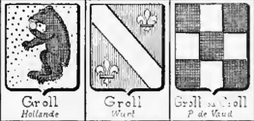 | Keywords: 3 Grolls - Rolland Illustrations of Rietstap.png blazon of en Groll Family fr Famille de Groll en Groll Holland Gold a black bear rampant collared and buckled gold holding in its sinister paw a golden ball to his mouth; Crest a black bear passant collared and buckled gold Groll Württemberg Baron June 15 1880 Gules red a band argent silver accompanied by two fleur-de-lis of the same; A crowned helmet above; Crest an ibex goat silver issuant langued of red Groll or Croll P de Vaud Swiss Chequy of five panes black to four silver' fr Groll Hollande D'or à un ours rampant de sable colleté et bouclé d'or portant de sa patte senestre à sa bouche une boule d'or Cimier un ours passant de sable colleté et bouclé d'or Arm V G Groll Württemberg Baron June 15 1880 De gueules à la bande d'argent acc de deux fleurs-de-lis du même Casque couronné Cimier un bouquetin issant d'argent langué de gueules Groll ou Croll P de Vaud Cinq points de sable équipollés à quatre d'argent' en Translation from original source text french Citation Rietstap Johannes Baptista 1828-1891 Armorial général ; précédé d'un Dictionnaire des termes du blason 1884 833 G B van Goor zonen fr fr Trois blasons des Familles de Groll de la Hollande le Württemberg Allemagne et P de Vaud Suisse en Three Groll Family Coats of Arms from Holland Württemberg Germany and P de Vaud Switzerland 1909 Victor Rolland 1843-1912 Citation Rolland Victor Planches de l'Armorial Général de J -B Rietstap 1909 III Plate C 100 Institut Héraldique Paris other versions <gallery> File V Groll - Coat of Arms png von Groll Coat of Arms File Groll Coat of Arms - Full svg Groll Coat of Arms - Full File Groll Coat of Arms - Shield Only svg Groll Coat of Arms - Shield </gallery> Custom license marker 2012 03 08 Grolltech PD-old-100 DEFAULTSORT Groll Uploaded with UploadWizard Coats of arms of Groll Family Armorial Rietstap |