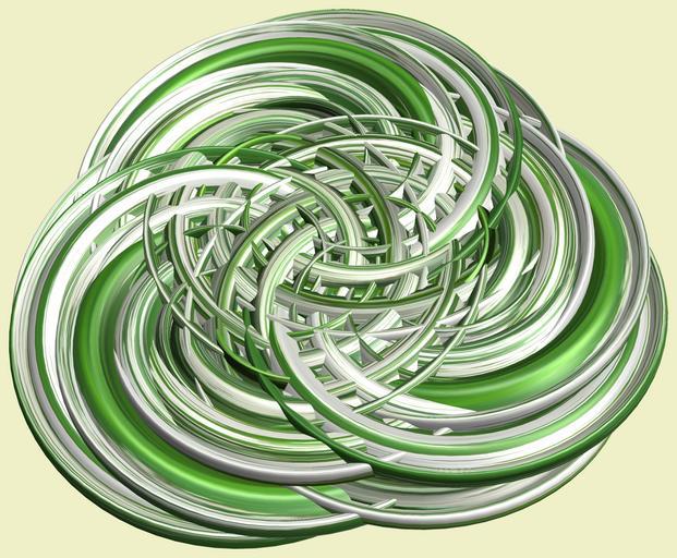 Keywords: mathematica 3d cg parametricplot3d texture torus code program algorithm プログラム コード アルゴリズム 輪環 りんかん ドーナツ どーなつ トーラス とーらす knot 結び目 むすびめ mapping テクスチャ マッピング 模様 もよう design pattern デザイン パターン graphic グラフィック グラフィクス structure 意匠 構造 symmetry 対称性 たいしょうせい シンメトリー 対称 たいしょう indoor white background abstract a = 12; (* center hole size of a torus *) b1 = 5;(* the number of angles *) b2 = 4;(* the number of waves *) b3 = 6; (* the number of knots *) c = 5; (* distance from the center of rotation *) d = 3; (* the number of tori *) h1 = 5; (* width of a torus *) h2 = 5; (* width of a torus *) h3 = 3; (* height of cross *) SetOptions[ParametricPlot3D, PlotRange -> Full, Mesh -> None, Boxed -> False, Axes -> None, PlotPoints -> 500, ImageSize -> 3000, Background -> RGBColor[{240, 240, 200}/255], PlotStyle -> Directive[Specularity[White, 50], Texture[Import["D:/tmp/911.jpg"]]], TextureCoordinateFunction -> ({#4, #5 /Pi} &), Lighting -> "Neutral"]; x = (a - h1 Cos[t] + h2 Sin[b1 s]) Cos[b3 s] + c; y = (a - h1 Cos[t] + h2 Sin[b1 s]) Sin[b3 s] + c; z = h3 Cos[b1 s] + Sin[b2 t] + c; rm = Table[{x, y, z}.RotationMatrix[2 i Pi/d, {0, 0, 1}], {i, d}]; ParametricPlot3D[rm, {t, 0, 2 Pi}, {s, 0, 2 Pi}] (*--- The Texture *) a = 12; (* center hole size of a torus *) b1 = 5;(* the number of angles *) b2 = 4;(* the number of waves *) b3 = 6; (* the number of knots *) c = 5; (* distance from the center of rotation *) d = 3; (* the number of tori *) h1 = 5; (* width of a torus *) h2 = 5; (* width of a torus *) h3 = 3; (* height of cross *) SetOptions[ParametricPlot3D, PlotRange -> Full, Mesh -> None, Boxed -> False, Axes -> None, PlotPoints -> 500, ImageSize -> 3000, Background -> RGBColor[{240, 240, 200}/255], PlotStyle -> Directive[Specularity[White, 50], Texture[Import["D:/tmp/911.jpg"]]], TextureCoordinateFunction -> ({#4, #5 /Pi} &), Lighting -> "Neutral"]; x = (a - h1 Cos[t] + h2 Sin[b1 s]) Cos[b3 s] + c; y = (a - h1 Cos[t] + h2 Sin[b1 s]) Sin[b3 s] + c; z = h3 Cos[b1 s] + Sin[b2 t] + c; rm = Table[{x, y, z}.RotationMatrix[2 i Pi/d, {0, 0, 1}], {i, d}]; ParametricPlot3D[rm, {t, 0, 2 Pi}, {s, 0, 2 Pi}] (*--- The Texture *) |