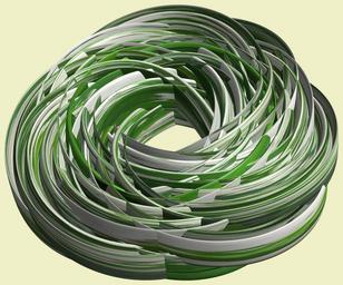 Keywords: mathematica 3d cg parametricplot3d texture torus code program algorithm プログラム コード アルゴリズム 輪環 りんかん ドーナツ どーなつ トーラス とーらす knot 結び目 むすびめ mapping テクスチャ マッピング 模様 もよう design pattern デザイン パターン graphic グラフィック グラフィクス structure 意匠 構造 symmetry 対称性 たいしょうせい シンメトリー 対称 たいしょう white background abstract indoor circle round a = 5; (* center hole size of a torus *) b1 = 5;(* the number of angles *) b2 = 4;(* the number of waves *) b3 = 4; (* the number of knots *) c = 1; (* distance from the center of rotation *) d = 3; (* the number of tori *) h1 = 1; (* width of a torus *) h2 = 1; (* width of a torus *) h3 = 1; (* height of cross *) SetOptions[ParametricPlot3D, PlotRange -> Full, Mesh -> None, Boxed -> False, Axes -> None, PlotPoints -> 500, ImageSize -> 3000, Background -> RGBColor[{240, 240, 200}/255], PlotStyle -> Directive[Specularity[White, 50], Texture[Import["D:/tmp/911.jpg"]]], TextureCoordinateFunction -> ({#4, #5 /Pi} &), Lighting -> "Neutral"]; x = (a - h1 Cos[t] + h2 Sin[b1 s]) Cos[b3 s] + c; y = (a - h1 Cos[t] + h2 Sin[b1 s]) Sin[b3 s] + c; z = h3 Cos[b1 s] + Sin[b2 t] + c; rm = Table[{x, y, z}.RotationMatrix[2 i Pi/d, {0, 0, 1}], {i, d}]; ParametricPlot3D[rm, {t, 0, 2 Pi}, {s, 0, 2 Pi}] (*--- The Texture *) a = 5; (* center hole size of a torus *) b1 = 5;(* the number of angles *) b2 = 4;(* the number of waves *) b3 = 4; (* the number of knots *) c = 1; (* distance from the center of rotation *) d = 3; (* the number of tori *) h1 = 1; (* width of a torus *) h2 = 1; (* width of a torus *) h3 = 1; (* height of cross *) SetOptions[ParametricPlot3D, PlotRange -> Full, Mesh -> None, Boxed -> False, Axes -> None, PlotPoints -> 500, ImageSize -> 3000, Background -> RGBColor[{240, 240, 200}/255], PlotStyle -> Directive[Specularity[White, 50], Texture[Import["D:/tmp/911.jpg"]]], TextureCoordinateFunction -> ({#4, #5 /Pi} &), Lighting -> "Neutral"]; x = (a - h1 Cos[t] + h2 Sin[b1 s]) Cos[b3 s] + c; y = (a - h1 Cos[t] + h2 Sin[b1 s]) Sin[b3 s] + c; z = h3 Cos[b1 s] + Sin[b2 t] + c; rm = Table[{x, y, z}.RotationMatrix[2 i Pi/d, {0, 0, 1}], {i, d}]; ParametricPlot3D[rm, {t, 0, 2 Pi}, {s, 0, 2 Pi}] (*--- The Texture *) |