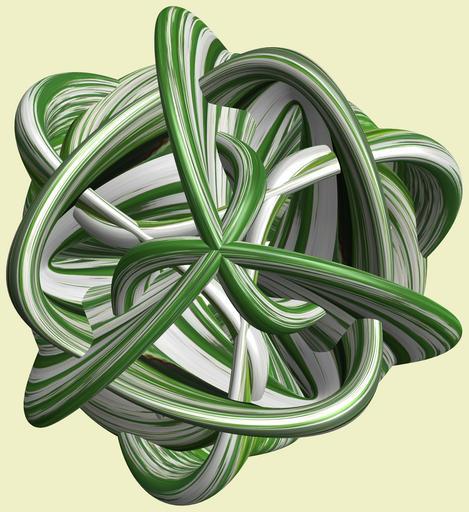 Keywords: mathematica 3d cg parametricplot3d texture torus code program algorithm プログラム コード アルゴリズム 輪環 りんかん ドーナツ どーなつ トーラス とーらす knot 結び目 むすびめ mapping テクスチャ マッピング 模様 もよう design pattern デザイン パターン graphic グラフィック グラフィクス structure 意匠 構造 symmetry 対称性 たいしょうせい シンメトリー 対称 たいしょう white background indoor cable a = 6; (* center hole size of a torus *) b1 = 5;(* the number of angles *) b2 = 2;(* the number of waves *) b3 = 3; (* the number of knots *) c = 5; (* distance from the center of rotation *) d = 3; (* the number of tori *) h1 = 5; (* width of a torus *) h2 = 2; (* width of a torus *) h3 = 7; (* height of cross *) SetOptions[ParametricPlot3D, PlotRange -> Full, Mesh -> None, Boxed -> False, Axes -> None, PlotPoints -> 500, ImageSize -> 3000, Background -> RGBColor[{240, 240, 200}/255], PlotStyle -> Directive[Specularity[White, 50], Texture[Import["D:/tmp/911.jpg"]]], TextureCoordinateFunction -> ({#4, #5 /Pi} &), Lighting -> "Neutral"]; x = (a - h1 Cos[t] + h2 Sin[b1 s]) Cos[b3 s] + c; y = (a - h1 Cos[t] + h2 Sin[b1 s]) Sin[b3 s] + c; z = h3 Cos[b1 s] + Sin[b2 t] + c; rm = Table[{x, y, z}.RotationMatrix[2 i Pi/d, {1, 1, 0}], {i, d}]; ParametricPlot3D[rm, {t, 0, 2 Pi}, {s, 0, 2 Pi}] (*--- The Texture Another shapes and colors *) a = 6; (* center hole size of a torus *) b1 = 5;(* the number of angles *) b2 = 2;(* the number of waves *) b3 = 3; (* the number of knots *) c = 5; (* distance from the center of rotation *) d = 3; (* the number of tori *) h1 = 5; (* width of a torus *) h2 = 2; (* width of a torus *) h3 = 7; (* height of cross *) SetOptions[ParametricPlot3D, PlotRange -> Full, Mesh -> None, Boxed -> False, Axes -> None, PlotPoints -> 500, ImageSize -> 3000, Background -> RGBColor[{240, 240, 200}/255], PlotStyle -> Directive[Specularity[White, 50], Texture[Import["D:/tmp/911.jpg"]]], TextureCoordinateFunction -> ({#4, #5 /Pi} &), Lighting -> "Neutral"]; x = (a - h1 Cos[t] + h2 Sin[b1 s]) Cos[b3 s] + c; y = (a - h1 Cos[t] + h2 Sin[b1 s]) Sin[b3 s] + c; z = h3 Cos[b1 s] + Sin[b2 t] + c; rm = Table[{x, y, z}.RotationMatrix[2 i Pi/d, {1, 1, 0}], {i, d}]; ParametricPlot3D[rm, {t, 0, 2 Pi}, {s, 0, 2 Pi}] (*--- The Texture Another shapes and colors *) |