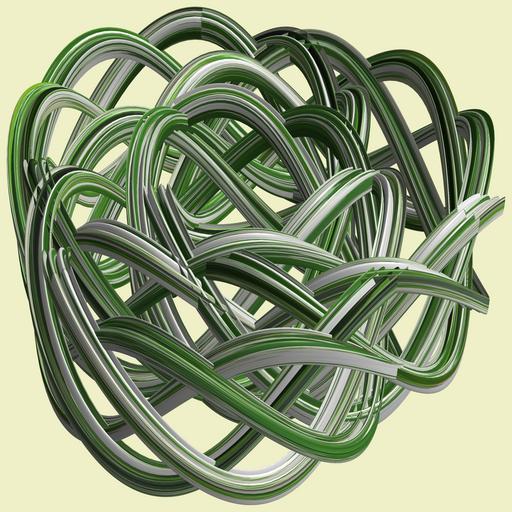 Keywords: mathematica 3d cg parametricplot3d texture torus code program algorithm プログラム コード アルゴリズム 輪環 りんかん ドーナツ どーなつ トーラス とーらす knot 結び目 むすびめ mapping テクスチャ マッピング 模様 もよう design pattern デザイン パターン graphic グラフィック グラフィクス structure 意匠 構造 symmetry 対称性 たいしょうせい シンメトリー 対称 たいしょう indoor a = 13; (* center hole size of a torus *) b1 = 9;(* the number of angles *) b2 = 4;(* the number of waves *) b3 = 4; (* the number of knots *) c = 4; (* distance from the center of rotation *) d = 3; (* the number of tori *) h1 = 1; (* width of a torus *) h2 = 1; (* width of a torus *) h3 = 8; (* height of cross *) SetOptions[ParametricPlot3D, PlotRange -> Full, Mesh -> None, Boxed -> False, Axes -> None, PlotPoints -> 500, ImageSize -> 3000, Background -> RGBColor[{240, 240, 200}/255], PlotStyle -> Directive[Specularity[White, 50], Texture[Import["D:/tmp/911.jpg"]]], TextureCoordinateFunction -> ({#4, #5 /Pi} &), Lighting -> "Neutral"]; x = (a - h1 Cos[t] + h2 Sin[b1 s]) Cos[b3 s] + c; y = (a - h1 Cos[t] + h2 Sin[b1 s]) Sin[b3 s] + c; z = h3 Cos[b1 s] + Sin[b2 t] + c; rm = Table[{x, y, z}.RotationMatrix[2 i Pi/d, {0, 0, 1}], {i, d}]; ParametricPlot3D[rm, {t, 0, 2 Pi}, {s, 0, 2 Pi}] (*--- The Texture Another shapes and colors *) a = 13; (* center hole size of a torus *) b1 = 9;(* the number of angles *) b2 = 4;(* the number of waves *) b3 = 4; (* the number of knots *) c = 4; (* distance from the center of rotation *) d = 3; (* the number of tori *) h1 = 1; (* width of a torus *) h2 = 1; (* width of a torus *) h3 = 8; (* height of cross *) SetOptions[ParametricPlot3D, PlotRange -> Full, Mesh -> None, Boxed -> False, Axes -> None, PlotPoints -> 500, ImageSize -> 3000, Background -> RGBColor[{240, 240, 200}/255], PlotStyle -> Directive[Specularity[White, 50], Texture[Import["D:/tmp/911.jpg"]]], TextureCoordinateFunction -> ({#4, #5 /Pi} &), Lighting -> "Neutral"]; x = (a - h1 Cos[t] + h2 Sin[b1 s]) Cos[b3 s] + c; y = (a - h1 Cos[t] + h2 Sin[b1 s]) Sin[b3 s] + c; z = h3 Cos[b1 s] + Sin[b2 t] + c; rm = Table[{x, y, z}.RotationMatrix[2 i Pi/d, {0, 0, 1}], {i, d}]; ParametricPlot3D[rm, {t, 0, 2 Pi}, {s, 0, 2 Pi}] (*--- The Texture Another shapes and colors *) |