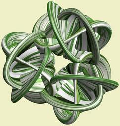 Keywords: mathematica 3d cg parametricplot3d texture torus code program algorithm プログラム コード アルゴリズム 輪環 りんかん ドーナツ どーなつ トーラス とーらす knot 結び目 むすびめ mapping テクスチャ マッピング 模様 もよう design pattern デザイン パターン graphic グラフィック グラフィクス structure 意匠 構造 symmetry 対称性 たいしょうせい シンメトリー 対称 たいしょう white background a = 6; (* center hole size of a torus *) b1 = 5;(* the number of angles *) b2 = 2;(* the number of waves *) b3 = 3; (* the number of knots *) c = 10; (* distance from the center of rotation *) d = 3; (* the number of tori *) h1 = 5; (* width of a torus *) h2 = 2; (* width of a torus *) h3 = 7; (* height of cross *) SetOptions[ParametricPlot3D, PlotRange -> Full, Mesh -> None, Boxed -> False, Axes -> None, PlotPoints -> 500, ImageSize -> 3000, Background -> RGBColor[{240, 240, 200}/255], PlotStyle -> Directive[Specularity[White, 50], Texture[Import["D:/tmp/911.jpg"]]], TextureCoordinateFunction -> ({#4, #5 /Pi} &), Lighting -> "Neutral"]; x = (a - h1 Cos[t] + h2 Sin[b1 s]) Cos[b3 s] + c; y = (a - h1 Cos[t] + h2 Sin[b1 s]) Sin[b3 s] + c; z = h3 Cos[b1 s] + Sin[b2 t] + c; rm = Table[{x, y, z}.RotationMatrix[2 i Pi/d, {1, 1, 0}], {i, d}]; ParametricPlot3D[rm, {t, 0, 2 Pi}, {s, 0, 2 Pi}] (*--- The Texture Another shapes and colors *) a = 6; (* center hole size of a torus *) b1 = 5;(* the number of angles *) b2 = 2;(* the number of waves *) b3 = 3; (* the number of knots *) c = 10; (* distance from the center of rotation *) d = 3; (* the number of tori *) h1 = 5; (* width of a torus *) h2 = 2; (* width of a torus *) h3 = 7; (* height of cross *) SetOptions[ParametricPlot3D, PlotRange -> Full, Mesh -> None, Boxed -> False, Axes -> None, PlotPoints -> 500, ImageSize -> 3000, Background -> RGBColor[{240, 240, 200}/255], PlotStyle -> Directive[Specularity[White, 50], Texture[Import["D:/tmp/911.jpg"]]], TextureCoordinateFunction -> ({#4, #5 /Pi} &), Lighting -> "Neutral"]; x = (a - h1 Cos[t] + h2 Sin[b1 s]) Cos[b3 s] + c; y = (a - h1 Cos[t] + h2 Sin[b1 s]) Sin[b3 s] + c; z = h3 Cos[b1 s] + Sin[b2 t] + c; rm = Table[{x, y, z}.RotationMatrix[2 i Pi/d, {1, 1, 0}], {i, d}]; ParametricPlot3D[rm, {t, 0, 2 Pi}, {s, 0, 2 Pi}] (*--- The Texture Another shapes and colors *) |