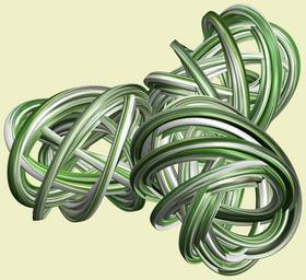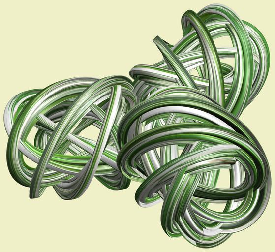 Keywords: mathematica 3d cg parametricplot3d texture torus code program algorithm プログラム コード アルゴリズム 輪環 りんかん ドーナツ どーなつ トーラス とーらす knot 結び目 むすびめ mapping テクスチャ マッピング 模様 もよう design pattern デザイン パターン graphic グラフィック グラフィクス structure 意匠 構造 symmetry 対称性 たいしょうせい シンメトリー 対称 たいしょう white background drawing indoor a = 8; (* center hole size of a torus *) b1 = 5;(* the number of angles *) b2 = 4;(* the number of waves *) b3 = 6; (* the number of knots *) c = 16; (* distance from the center of rotation *) d = 3; (* the number of tori *) h1 = 2; (* width of a torus *) h2 = 2; (* width of a torus *) h3 = 11; (* height of cross *) SetOptions[ParametricPlot3D, PlotRange -> Full, Mesh -> None, Boxed -> False, Axes -> None, PlotPoints -> 500, ImageSize -> 3000, Background -> RGBColor[{240, 240, 200}/255], PlotStyle -> Directive[Specularity[White, 50], Texture[Import["D:/tmp/911.jpg"]]], TextureCoordinateFunction -> ({#4, #5 /Pi} &), Lighting -> "Neutral"]; x = (a - h1 Cos[t] + h2 Sin[b1 s]) Cos[b3 s] + c; y = (a - h1 Cos[t] + h2 Sin[b1 s]) Sin[b3 s] + c; z = h3 Cos[b1 s] + Sin[b2 t] + c; rm = Table[{x, y, z}.RotationMatrix[2 i Pi/d, {1, 1, 0}], {i, d}]; ParametricPlot3D[rm, {t, 0, 2 Pi}, {s, 0, 2 Pi}] (*--- The Texture Another shapes and colors *) a = 8; (* center hole size of a torus *) b1 = 5;(* the number of angles *) b2 = 4;(* the number of waves *) b3 = 6; (* the number of knots *) c = 16; (* distance from the center of rotation *) d = 3; (* the number of tori *) h1 = 2; (* width of a torus *) h2 = 2; (* width of a torus *) h3 = 11; (* height of cross *) SetOptions[ParametricPlot3D, PlotRange -> Full, Mesh -> None, Boxed -> False, Axes -> None, PlotPoints -> 500, ImageSize -> 3000, Background -> RGBColor[{240, 240, 200}/255], PlotStyle -> Directive[Specularity[White, 50], Texture[Import["D:/tmp/911.jpg"]]], TextureCoordinateFunction -> ({#4, #5 /Pi} &), Lighting -> "Neutral"]; x = (a - h1 Cos[t] + h2 Sin[b1 s]) Cos[b3 s] + c; y = (a - h1 Cos[t] + h2 Sin[b1 s]) Sin[b3 s] + c; z = h3 Cos[b1 s] + Sin[b2 t] + c; rm = Table[{x, y, z}.RotationMatrix[2 i Pi/d, {1, 1, 0}], {i, d}]; ParametricPlot3D[rm, {t, 0, 2 Pi}, {s, 0, 2 Pi}] (*--- The Texture Another shapes and colors *) |