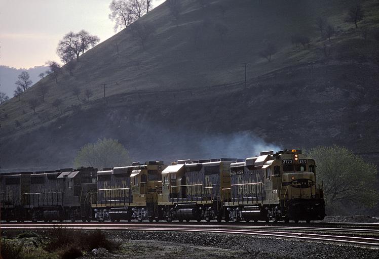 | Keywords: santa fe santafe outdoor railroad vehicle locomotive train landscape mountainside He took these in March 1985. The trains were headed geographically west. The tracks make a U-turn at Caliente and just at the right edge of the photos (at cab level) you can see the track at the beginning the climb up the Tehachapi Mountains. The lead AT&SF diesel was 2773 and the SP was 8571. You gotta love the lighting. He took these in March 1985. The trains were headed geographically west. The tracks make a U-turn at Caliente and just at the right edge of the photos (at cab level) you can see the track at the beginning the climb up the Tehachapi Mountains. The lead AT&SF diesel was 2773 and the SP was 8571. You gotta love the lighting. |
