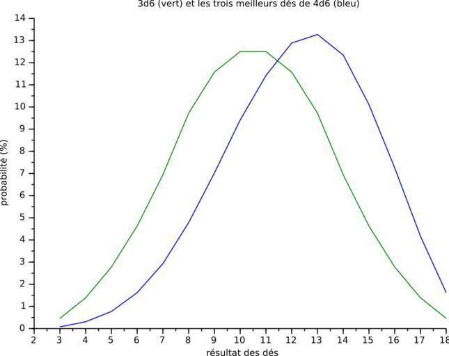 Keywords: 3d6 et 3 meillleurs de 4d6.svg fr Comparaison entre les probabilités d'avoir une valeur en sommant trois dés à six faces 3d6 et en tirant quatre dés et en faisant la somme des trois meilleurs en Comparison between the probabilities to have a value summing three six-sided dice 3d6 and summing the three best dice amongst four own 2013-10-24 Christophe Dang Ngoc Chan Cdang <span class signature-talk >talk</span> PNG File 3d6 et 3 meillleurs de 4d6 png; box plot File Boite a moustaches 3d6 et 3 meilleurs 4d6 svg cdang scilab source <source lang scilab > // Calcul de probabilités de jets de dés par dénombrement nfaces 6; // nombre de faces du dé // somme de 3d freq_3d zeros 2 3 nfaces-2 ; // initialisation freq_3d 1 3 3 nfaces; nbtirages_3d nfaces 3; for i 1 nfaces for j 1 nfaces for k 1 nfaces somme i + j + k; freq_3d 2 somme-2 freq_3d 2 somme-2 + 1; end end end freq_3d 2 100 freq_3d 2 /nbtirages_3d; // normalisation en // somme de 3 meilleurs d parmi 4 freq_4d zeros 2 3 nfaces-2 ; // initialisation freq_4d 1 3 3 nfaces; nbtirages_4d nfaces 4; for i 1 nfaces for j 1 nfaces for k 1 nfaces for l 1 nfaces vecteur gsort i j k l ; somme sum vecteur 1 3 ; freq_4d 2 somme-2 freq_4d 2 somme-2 + 1; end end end end freq_4d 2 100 freq_4d 2 /nbtirages_4d; // normalisation en // Tracé plot2d freq_3d 1 freq_3d 2 style 13 plot2d freq_4d 1 freq_4d 2 style 2 xtitle 3d6 vert et les trois meilleurs dés de 4d6 bleu résultat des dés probabilité </source> Dice probability Cc-zero |