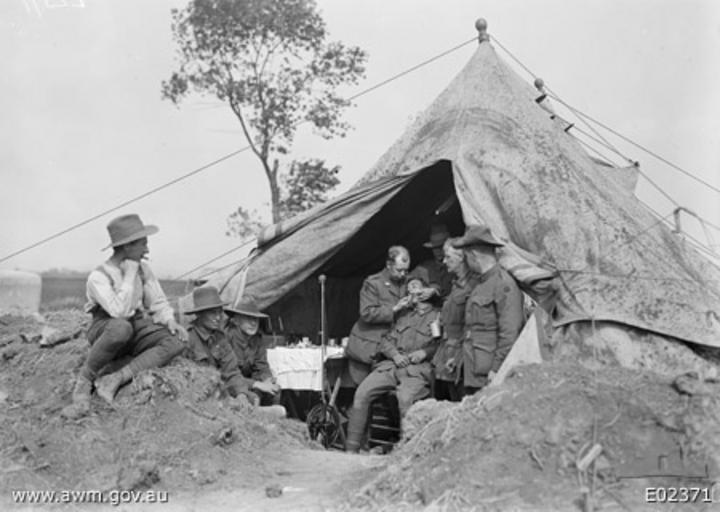 Keywords: 3rd Dental Unit (AWM E02371).jpg AWM Caption France Picardie Somme Bussy A dental officer of the 34th Australian Dental Unit working at an advanced post at NC 4 9 2 Sheet 62D The sides of the tent was revetted as the staff sleep within and the Germans dropped three bombs within 100 yards of this place one evening This was the most advanced unit working in the Corbie Sector during June and July It gave attention to men requiring immediate relief from the front line and support line The unit worked here for about seven weeks Left to right Driver A E Reid 27th Army Service Corps Private Pte J McTeay 13th Field Ambulance Buglar Gordon http //deepthought hass adfa edu au 8080/showPerson pid 101619 Captain F R Forster Officer Commanding 34th Dental Unit Pte R Turpin patient http //deepthought hass adfa edu au 8080/showPerson pid 254960 10664 Staff Sergeant SSgt William Thomas Rickey 34th Dental Unit behind http //deepthought hass adfa edu au 8080/showPerson pid 207740 13323 Pte Ernest Edward Mildern Orderly 34th Dental Unit http //deepthought hass adfa edu au 8080/showPerson pid 3356 8866 SSgt L H Allen 34th Dental Unit E02371 Originally uploaded in May 2007 to en Wikipedia http //en wikipedia org/w/index php title Special Log page File 3rd_Dental_Unit_ AWM_E02371 jpg log by Nick-D talk 1918-06-03 photographer not identified Copyright expired - public domain PD-AustraliaGov World War I forces of Australia in France Military medical services in World War I Dentists at work Black and white photographs of war Bussy-lès-Daours |