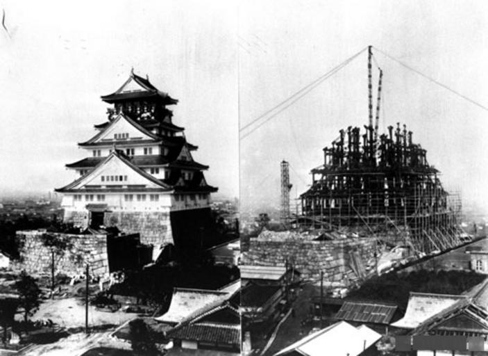 | Keywords: 3rd Osaka Castle Keep Tower completion and under construction.jpg 3rd Osaka Castle Keep Tower (left is completion in 1931 / right is under construction in 1930 1930 年の建設 上の鉄骨と1931年完成直後の3代目大阪城天守閣 http //mainichi jp/select/wadai/graph/japaneasecastle/15 html completion in 1931 and under construction in 1930 毎日新聞社 PD-Japan-oldphoto Osaka Castle Keep Tower | ||||