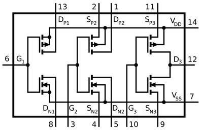 MAKE A MEME View Large Image 4007 Functional Diagram.svg en A functional diagram of the 4007 dual complementary pair and inverter This IC has three p-channel and three n-channel enhancement-mode MOSFETs with access to each device own Inductiveload 2009-06-22 4000 ...