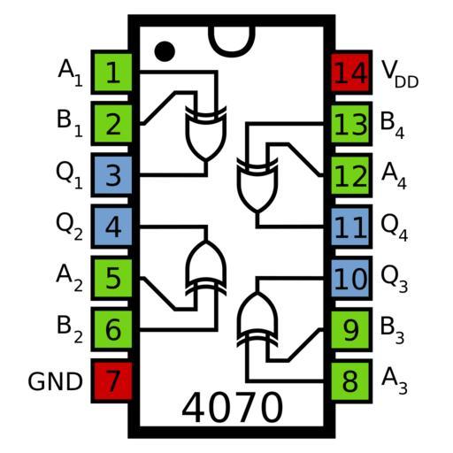 MAKE A MEME View Large Image 4070 Pinout.svg en Pinout diagram of the the 4070 Quad 2-Input XOR gate CMOS IC own Inductiveload 2008-12-23 IC pinout diagrams 4000 Series