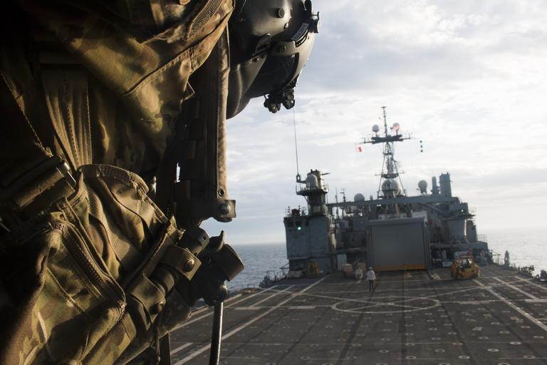| Keywords: 40th cab 40thcab 40th combat aviation brigade 40thcombataviationbrigade ch-47 chinook ch47chinook chinook helicopter deck landing qualification decklandingqualification dlq deck landing decklanding uss ponce ussponce afsb afloat forward staging base afloatforwardstagingbase aviation pilot army soldier california army national guard californiaarmynationalguard 1-168 avn 1168avn washington national guard washingtonnationalguard oregon national guard oregonnationalguard persian gulf persiangulf outdoor An Army National Guard crew chief from Company B, 1st Battalion, 168th Aviation Regiment, 40th Combat Aviation Brigade, looks out of his Ch-47 Chinook helicopter as it lands aboard the USS Ponce, an Afloat Forward Staging Base, in the Persian Gulf March 14. The 40th CAB practices landings aboard Naval vessels every month. (U.S. Army photo by Staff Sgt. Ian M. Kummer) An Army National Guard crew chief from Company B, 1st Battalion, 168th Aviation Regiment, 40th Combat Aviation Brigade, looks out of his Ch-47 Chinook helicopter as it lands aboard the USS Ponce, an Afloat Forward Staging Base, in the Persian Gulf March 14. The 40th CAB practices landings aboard Naval vessels every month. (U.S. Army photo by Staff Sgt. Ian M. Kummer) |