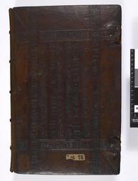 Keywords: 41258. "HENR-ICUS- DE BRACTONE" (16th cent. title), De Legibus et Consuetudinibus Angliae. -Manuscript on parchment Circ. A.D. 1300. -- - Upper cover (Add Ms 41258).jpg Style Panel design; Caption Upper cover; Colour Brown; Edge Unspecified exhibition history Decorative Technique Tooled in blind; Cover Material Calf Binding of bevelled oak boards covered with brown leather 16th cent Intersecting vertical and horizontal blind rolls form a large central panel rectangular in shape filled with impressions of the same roll cup etc in the Renaissance manner alternating with another object history Text 14c; England; Unspecified object type Cc-zero place of creation Binding England place of discovery See Oldham English Blind Stamped Bindings rolls HEd 1 and another roll not yet identified British Library image http //www bl uk/catalogues/bookbindings/LargeImage aspx RecordId 020-000016353 ImageId ImageId 55718 Copyright BL 41258 HENRICUS DE BRACTONE 16th cent title De Legibus et Consuetudinibus Angliae Manuscript on parchment Circ A D 1300 Uploaded with GWToolset 41258 HENRICUS DE BRACTONE 16th cent title De Legibus et Consuetudinibus Angliae Manuscript on parchment Circ A D 1300 - Upper cover Add Ms 41258 http //www webarchive org uk/bldatasets/bindings/Add41528 jpg Bookbinding 16th-century bookbinding British Library Bookbindings |