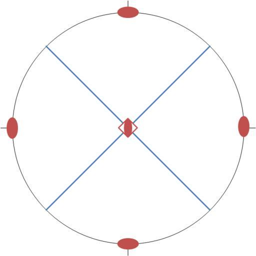 Keywords: -42m point group.png en Stereographic représentation of the symmetry point group -42m The 001 direction is perpendicular to the projection plane The mirror planes are represented in blue the rotation axes in red The thin black ticks show the direction of the equivalent crystallographic axes a and b fr Représentation stéréographique du groupe ponctuel de symétrie -42m La direction 001 est perpendiculaire au plan de projection Les plans miroirs sont représentés en bleu les axes de rotation en rouge Les trait fins noirs montrent la direction des axes cristallographiques équivalents a et b own Perditax 2011-06-05 Point groups Cc-zero |