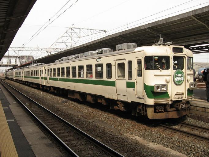 Keywords: 455 S72 Koriyama 20080323.jpg en JR East 455 series set S72 at Koriyama Station on a special Farewell 455 series working ja ã Œã•よãªã‚‰455ç³»ã 臨時列車 郡山駅ã«ã¦ 2008-03-23 Self-photographed by the original uploader æ ¬äººæ’®å½± Transferred from Japanese Wikipedia; ja File 臨時㠌ã•よãªã‚‰455ç³»ã jpg ç·‘15å· w ja Custom license marker 2014 04 04 ç·‘15å· original upload log ã Œã•よãªã‚‰455ç³»ã 臨時列車ã 郡山駅ã«ã¦ Moved from Japanese Wikipedia/FileHistory UTC 2009-02-01 01 16 1 024 × 768 ç·‘15å· <nowiki> ã Œã•よãªã‚‰455ç³»ã 臨時列車ã 郡山駅ã«ã¦ï¼ˆ2008å¹´3æ ˆ23æ—¥ã æ ¬äººæ’®å½±ï¼‰ GFDL </nowiki> Moved from Japanese Wikipedia/PageHistory UTC 2009-02-01 01 16 ç·‘15å· <nowiki> ã Œã•よãªã‚‰455ç³»ã 臨時列車ã 郡山駅ã«ã¦ï¼ˆ2008å¹´3æ ˆ23æ—¥ã æ ¬äººæ’®å½±ï¼‰ GFDL </nowiki> Uploaded with UploadWizard JNR 455 JR East Trains at KÅriyama Station Fukushima Charter trains of Japan Rail transport events in Japan 2008 in rail transport in Japan 2008 events in Japan March 2008 in Japan Train headboards in Japan Green and white rail vehicles Number 455 on vehicles Photographs taken on 2008-03-23 Trains facing right |