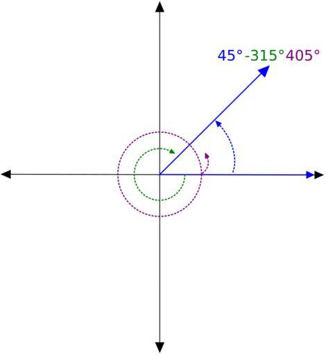 Keywords: 45, -315, and 405 co-terminal angles.svg en 45° ˆ’315° and 405° angles which are all co-terminal own Adrignola 2010-12-02 High School Trigonometry Adjacent angles 45° rotation Reflex angles Angles greater than 360° Rotation Euclidean plane |