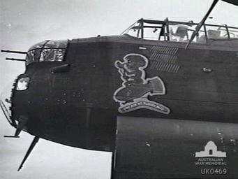 | Keywords: 467 Squadron RAAF Lancaster R for Robert Waddington Aug 1943 AWM UK0469.jpg AWM caption LINCOLNSHIRE ENGLAND 1943-08-31 CREST ON R FOR ROBERT A LANCASTER AIRCRAFT BELONGING TO NO 467 SQUADRON RAAF OF BOMBER COMMAND BASED AT RAF STATION WADDINGTON ORIGINALLY W FOR WILLIE THE EMBLEM REPRESENTS KING BILLY SITTING ON A BOMB IT WAS DESIGNED AND PAINTED BY 11181 SERGEANT A M A BARNETT CARTOONIST OF RAAF OVERSEAS HEADQUARTERS LONDON THE SPEAR TIPS REPRESENT THE RAIDS OVER ENEMY TERRITORY AND THE DFC WAS WON BY THE CAPTAIN 408806 PILOT OFFICER J GOOD DFC WINSLOW VIC UK0469 1943-08-31 not stated Copyright expired - public domain PD-AustraliaGov No 467 Squadron RAAF Avro Lancaster in Australian service Nose art on Avro Lancaster RAF Waddington William Lanne |