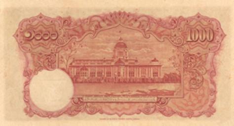 Keywords: 4.1000bahtbk.gif en Reverse side of the THB 1 000 banknote Series 4 - first come into circulation during the reign of King Rama VIII circa 1938 th ภาพด้านหลังของธนบัตรราคา 1000 บาท แบบ 4 ออกใช้ในสมัยรัชกาลที่ 8 ราวปี พ ศ 2481 1938 https //www bot or th/Thai/Banknotes/HistoryAndSeriesOfBanknotes/Pages/Banknote_Series04_2 aspx Bank of Thailand other versions Custom license marker 2015 03 14 PD-Thailand Uploaded with UploadWizard Banknotes of Thailand Banknotes with a face value of 1000 |
