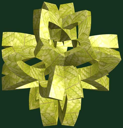 Keywords: mathematica 3d cg parametricplot3d texture torus code program algorithm プログラム コード アルゴリズム 輪環 りんかん ドーナツ どーなつ 六芒星 ろくぼうせい geometric sculpture geometricsculpture shape geometry sculpture mapping テクスチャ マッピング 模様 もよう abstract 抽象 ちゅうしょう アブストラクト design pattern デザイン パターン graphic グラフィック グラフィクス structure 意匠 構造 symmetry 対称性 たいしょうせい シンメトリー 対称 たいしょう foliage plant leaf outdoor tree a = 4; (* center hole size *) b = 6; (* hexa-torus *) c = -2; (* distance from the center of rotation *) d = 4; (* number of torus *) h = 1; (* height of a torus *) SetOptions[ParametricPlot3D, PlotRange -> Full, Mesh -> None, Boxed -> False, Axes -> False, PlotPoints -> 400, ImageSize -> 3000, Background -> RGBColor[{20, 50, 30}/255], PlotStyle -> Directive[Specularity[White, 30], Texture[Import["D:/tmp/71.jpg"]]], TextureCoordinateFunction -> ({#4, #5 Pi} &), Lighting -> "Neutral"]; f[v_] := TriangleWave[{-1, 1}, v/(2 Pi)]; g[v_] := TriangleWave[{-1, 1}, v/(2 Pi) + 1/4]; x = (a - g[t] - f[b s]) Cos[s]; y = (a - g[t] - f[b s]) Sin[s]; z = (a - f[t] - h f[b s]) + c; rm = Table[{x, y, z}.RotationMatrix[2 i Pi/d, {1, 1, 0}], {i, d}]; ParametricPlot3D[rm, {t, 0, 2 Pi}, {s, 0, Pi}] (*--- The Texture *) a = 4; (* center hole size *) b = 6; (* hexa-torus *) c = -2; (* distance from the center of rotation *) d = 4; (* number of torus *) h = 1; (* height of a torus *) SetOptions[ParametricPlot3D, PlotRange -> Full, Mesh -> None, Boxed -> False, Axes -> False, PlotPoints -> 400, ImageSize -> 3000, Background -> RGBColor[{20, 50, 30}/255], PlotStyle -> Directive[Specularity[White, 30], Texture[Import["D:/tmp/71.jpg"]]], TextureCoordinateFunction -> ({#4, #5 Pi} &), Lighting -> "Neutral"]; f[v_] := TriangleWave[{-1, 1}, v/(2 Pi)]; g[v_] := TriangleWave[{-1, 1}, v/(2 Pi) + 1/4]; x = (a - g[t] - f[b s]) Cos[s]; y = (a - g[t] - f[b s]) Sin[s]; z = (a - f[t] - h f[b s]) + c; rm = Table[{x, y, z}.RotationMatrix[2 i Pi/d, {1, 1, 0}], {i, d}]; ParametricPlot3D[rm, {t, 0, 2 Pi}, {s, 0, Pi}] (*--- The Texture *) |