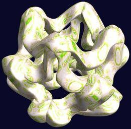 Keywords: mathematica 3d cg parametricplot3d texture torus 輪環 りんかん ドーナツ どーなつ 六芒星 ろくぼうせい 六光星 ろくこうせい 六稜星 ろくりょうせい code program algorithm コード プログラム アルゴリズム hexagram geometric sculpture geometricsculpture shape geometry sculpture mapping テクスチャ マッピング 模様 もよう abstract 抽象 ちゅうしょう アブストラクト design pattern デザイン パターン graphic グラフィック グラフィクス structure 意匠 構造 symmetry 対称性 たいしょうせい シンメトリー 対称 たいしょう algorithm コード black background indoor flower plant food photo border a = 6; (* center hole size of a torus *) b = 6; (* hexa-torus *) c = 0; (* distance from the center of rotation *) d = 4; (* number of torus *) h = 1; (* height of a torus *) SetOptions[ParametricPlot3D, PlotRange -> Full, Mesh -> None, Boxed -> False, Axes -> False, PlotPoints -> 400, ImageSize -> 3000, Background -> RGBColor[{10, 10, 40}/255], PlotStyle -> Directive[Specularity[White, 30], Texture[Import["D:/tmp/864.jpg"]]], TextureCoordinateFunction -> ({#4, #5 2 Pi} &), Lighting -> "Neutral"]; f[v_] := Sin[2 Sin[Sin[Sin[v]]]]; x = (a - Cos[t] - Sin[b s]) Cos[s + Pi/(2 b)] + c; y = (a - Cos[t] - Sin[b s]) Sin[s + Pi/(2 b)] + c; z = (f[t] - h f[b s]) + c; rot = Table[{x, y, z}.RotationMatrix[2 i Pi/d, {0, 1, 1}], {i, d}]; ParametricPlot3D[rot, {t, 0, 2 Pi}, {s, 0, 2 Pi}] (*--- The Texture *) a = 6; (* center hole size of a torus *) b = 6; (* hexa-torus *) c = 0; (* distance from the center of rotation *) d = 4; (* number of torus *) h = 1; (* height of a torus *) SetOptions[ParametricPlot3D, PlotRange -> Full, Mesh -> None, Boxed -> False, Axes -> False, PlotPoints -> 400, ImageSize -> 3000, Background -> RGBColor[{10, 10, 40}/255], PlotStyle -> Directive[Specularity[White, 30], Texture[Import["D:/tmp/864.jpg"]]], TextureCoordinateFunction -> ({#4, #5 2 Pi} &), Lighting -> "Neutral"]; f[v_] := Sin[2 Sin[Sin[Sin[v]]]]; x = (a - Cos[t] - Sin[b s]) Cos[s + Pi/(2 b)] + c; y = (a - Cos[t] - Sin[b s]) Sin[s + Pi/(2 b)] + c; z = (f[t] - h f[b s]) + c; rot = Table[{x, y, z}.RotationMatrix[2 i Pi/d, {0, 1, 1}], {i, d}]; ParametricPlot3D[rot, {t, 0, 2 Pi}, {s, 0, 2 Pi}] (*--- The Texture *) |