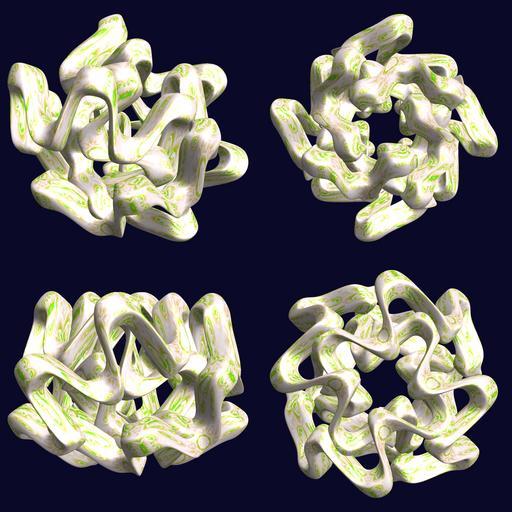 Keywords: mathematica 3d cg parametricplot3d texture torus 輪環 りんかん ドーナツ どーなつ 六芒星 ろくぼうせい 六光星 ろくこうせい 六稜星 ろくりょうせい code program algorithm コード プログラム アルゴリズム hexagram geometric sculpture geometricsculpture shape geometry sculpture mapping テクスチャ マッピング 模様 もよう abstract 抽象 ちゅうしょう アブストラクト design pattern デザイン パターン graphic グラフィック グラフィクス structure 意匠 構造 symmetry 対称性 たいしょうせい シンメトリー 対称 たいしょう algorithm コード black background indoor blossom plant a = 6; (* center hole size of a torus *) b = 6; (* hexa-torus *) c = 2; (* distance from the center of rotation *) d = 4; (* number of torus *) h = 2; (* height of a torus *) SetOptions[ParametricPlot3D, PlotRange -> Full, Mesh -> None, Boxed -> False, Axes -> False, PlotPoints -> 400, ImageSize -> 1600, Background -> RGBColor[{10, 10, 40}/255], PlotStyle -> Directive[Specularity[White, 30], Texture[Import["D:/tmp/864.jpg"]]], TextureCoordinateFunction -> ({#4, #5 2 Pi} &), Lighting -> "Neutral"]; f[v_] := Sin[2 Sin[Sin[Sin[v]]]]; x = (a - Cos[t] - Sin[b s]) Cos[s + Pi/(2 b)] + c; y = (a - Cos[t] - Sin[b s]) Sin[s + Pi/(2 b)] + c; z = (f[t] - h f[b s]) + c; rot = Table[{x, y, z}.RotationMatrix[2 i Pi/d, {0, 1, 1}], {i, d}]; ParametricPlot3D[rot, {t, 0, 2 Pi}, {s, 0, 2 Pi}] (*--- The Texture *) a = 6; (* center hole size of a torus *) b = 6; (* hexa-torus *) c = 2; (* distance from the center of rotation *) d = 4; (* number of torus *) h = 2; (* height of a torus *) SetOptions[ParametricPlot3D, PlotRange -> Full, Mesh -> None, Boxed -> False, Axes -> False, PlotPoints -> 400, ImageSize -> 1600, Background -> RGBColor[{10, 10, 40}/255], PlotStyle -> Directive[Specularity[White, 30], Texture[Import["D:/tmp/864.jpg"]]], TextureCoordinateFunction -> ({#4, #5 2 Pi} &), Lighting -> "Neutral"]; f[v_] := Sin[2 Sin[Sin[Sin[v]]]]; x = (a - Cos[t] - Sin[b s]) Cos[s + Pi/(2 b)] + c; y = (a - Cos[t] - Sin[b s]) Sin[s + Pi/(2 b)] + c; z = (f[t] - h f[b s]) + c; rot = Table[{x, y, z}.RotationMatrix[2 i Pi/d, {0, 1, 1}], {i, d}]; ParametricPlot3D[rot, {t, 0, 2 Pi}, {s, 0, 2 Pi}] (*--- The Texture *) |
