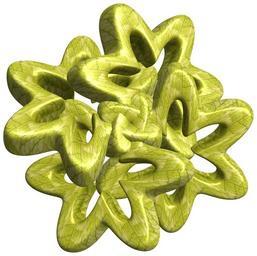 Keywords: mathematica 3d cg parametricplot3d texture torus 輪環 りんかん ドーナツ どーなつ 六芒星 ろくぼうせい 六光星 ろくこうせい 六稜星 ろくりょうせい program プログラム code コード algorithm コード アルゴリズム hexagram geometric sculpture geometricsculpture shape geometry sculpture mapping テクスチャ マッピング 模様 もよう abstract 抽象 ちゅうしょう アブストラクト design pattern デザイン パターン graphic グラフィック グラフィクス structure 意匠 構造 symmetry 対称性 たいしょうせい シンメトリー 対称 たいしょう algorithm white background food indoor organic pattern a = 3;(* center hole size of a torus *) b = 6;(* hexa-torus *) c = 2.6;(* distance from the center of rotation *) d = 4;(* number of torus *) SetOptions[ParametricPlot3D, PlotRange -> Full, Mesh -> None, Boxed -> False, Axes -> None, PlotPoints -> 400, ImageSize -> 3000, PlotStyle -> Directive[Specularity[White, 50], Texture[Import["D:/tmp/71.jpg"]]], TextureCoordinateFunction -> ({#4, #5 b Pi} &), Lighting -> "Neutral"]; x = (a - Cos[t] - Sin[b s]) Cos[s + Pi/(2 b)] + c; y = Sin[2 Sin[Sin[Sin[t]]]] + c; z = (a - Cos[t] - Sin[b s]) Sin[s + Pi/(2 b)] + c; rot = Table[{x, y, z}.RotationMatrix[2 i Pi/d, {1, 2, 0}], {i, d}]; ParametricPlot3D[rot, {t, 0, 2 Pi}, {s, 0, 2 Pi}] (*--- The Texture *) a = 3;(* center hole size of a torus *) b = 6;(* hexa-torus *) c = 2.6;(* distance from the center of rotation *) d = 4;(* number of torus *) SetOptions[ParametricPlot3D, PlotRange -> Full, Mesh -> None, Boxed -> False, Axes -> None, PlotPoints -> 400, ImageSize -> 3000, PlotStyle -> Directive[Specularity[White, 50], Texture[Import["D:/tmp/71.jpg"]]], TextureCoordinateFunction -> ({#4, #5 b Pi} &), Lighting -> "Neutral"]; x = (a - Cos[t] - Sin[b s]) Cos[s + Pi/(2 b)] + c; y = Sin[2 Sin[Sin[Sin[t]]]] + c; z = (a - Cos[t] - Sin[b s]) Sin[s + Pi/(2 b)] + c; rot = Table[{x, y, z}.RotationMatrix[2 i Pi/d, {1, 2, 0}], {i, d}]; ParametricPlot3D[rot, {t, 0, 2 Pi}, {s, 0, 2 Pi}] (*--- The Texture *) |