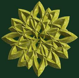 Keywords: mathematica 3d cg parametricplot3d texture torus code program algorithm プログラム コード アルゴリズム 輪環 りんかん ドーナツ どーなつ 八芒星 はちぼうせい geometric sculpture geometricsculpture shape geometry sculpture mapping テクスチャ マッピング 模様 もよう abstract 抽象 ちゅうしょう アブストラクト design pattern デザイン パターン graphic グラフィック グラフィクス structure 意匠 構造 symmetry 対称性 たいしょうせい シンメトリー 対称 たいしょう organic pattern plant foliage outdoor tree black background leaf a = 3; (* center hole size *) b = 8; (* octa-torus *) c = 1; (* distance from the center of rotation *) d = 4; (* number of torus *) h = 0; (* height of a torus *) SetOptions[ParametricPlot3D, PlotRange -> Full, Mesh -> None, Boxed -> False, Axes -> False, PlotPoints -> 400, ImageSize -> 3000, Background -> RGBColor[{20, 50, 30}/255], PlotStyle -> Directive[Specularity[White, 30], Texture[Import["D:/tmp/71.jpg"]]], TextureCoordinateFunction -> ({#4, #5 Pi} &), Lighting -> "Neutral"]; f[v_] := TriangleWave[{-1, 1}, v/(2 Pi)]; g[v_] := TriangleWave[{-1, 1}, v/(2 Pi) + 1/4]; x = (a - g[t] - f[b s]) Cos[s] + c; y = (a - g[t] - f[b s]) Sin[s] + c; z = (a - f[t] - h f[b s]); rm = Table[{x, y, z}.RotationMatrix[2 i Pi/d, {0, 0, 1}], {i, d}]; ParametricPlot3D[rm, {t, 0, 2 Pi}, {s, 0, Pi}] (*--- The Texture *) a = 3; (* center hole size *) b = 8; (* octa-torus *) c = 1; (* distance from the center of rotation *) d = 4; (* number of torus *) h = 0; (* height of a torus *) SetOptions[ParametricPlot3D, PlotRange -> Full, Mesh -> None, Boxed -> False, Axes -> False, PlotPoints -> 400, ImageSize -> 3000, Background -> RGBColor[{20, 50, 30}/255], PlotStyle -> Directive[Specularity[White, 30], Texture[Import["D:/tmp/71.jpg"]]], TextureCoordinateFunction -> ({#4, #5 Pi} &), Lighting -> "Neutral"]; f[v_] := TriangleWave[{-1, 1}, v/(2 Pi)]; g[v_] := TriangleWave[{-1, 1}, v/(2 Pi) + 1/4]; x = (a - g[t] - f[b s]) Cos[s] + c; y = (a - g[t] - f[b s]) Sin[s] + c; z = (a - f[t] - h f[b s]); rm = Table[{x, y, z}.RotationMatrix[2 i Pi/d, {0, 0, 1}], {i, d}]; ParametricPlot3D[rm, {t, 0, 2 Pi}, {s, 0, Pi}] (*--- The Texture *) |