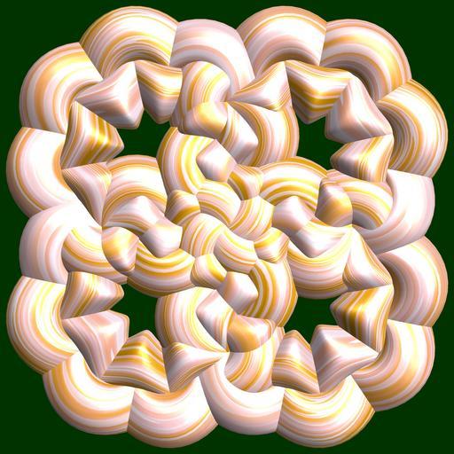 Keywords: mathematica 3d cg parametricplot3d texture torus 輪環 りんかん ドーナツ どーなつ 八芒星 はちぼうせい 八光星 はちこうせい 八稜星 はちりょうせい program プログラム code コード algorithm コード アルゴリズム geometric sculpture geometricsculpture shape geometry sculpture mapping テクスチャ マッピング 模様 もよう abstract 抽象 ちゅうしょう アブストラクト design pattern デザイン パターン graphic グラフィック グラフィクス structure 意匠 構造 symmetry 対称性 たいしょうせい シンメトリー 対称 たいしょう algorithm bright SetOptions[ParametricPlot3D, PlotRange -> Full, Mesh -> None, Boxed -> False, Axes -> None, PlotPoints -> 300, ImageSize -> 3000, Background -> Darker[Green, 0.8], PlotStyle -> Directive[Specularity[White, 30], Texture[Import["D:/tmp/861.jpg"]]], TextureCoordinateFunction -> ({#4 + #5, #5/Pi} &), Lighting -> "Neutral"]; a = 3; (* center hole size of a torus *) b = 8; (* octa-torus *) c = 2.5; (* distance from the center of rotation *) d = 4; (* number of torus *) v = 3; x = (a - Cos[t] - Sin[b s]) Cos[v s] + c; y = Sin[t] Sin[b s] + c; z = (a - Cos[t] - Sin[b s]) Sin[v s] + c; rot = Table[{x, y, z}.RotationMatrix[2 i Pi/d, {0, 1, 0}], {i, d}]; ParametricPlot3D[rot, {t, 0, 2 Pi}, {s, 0, 2 Pi}] (*--- The Texture *) SetOptions[ParametricPlot3D, PlotRange -> Full, Mesh -> None, Boxed -> False, Axes -> None, PlotPoints -> 300, ImageSize -> 3000, Background -> Darker[Green, 0.8], PlotStyle -> Directive[Specularity[White, 30], Texture[Import["D:/tmp/861.jpg"]]], TextureCoordinateFunction -> ({#4 + #5, #5/Pi} &), Lighting -> "Neutral"]; a = 3; (* center hole size of a torus *) b = 8; (* octa-torus *) c = 2.5; (* distance from the center of rotation *) d = 4; (* number of torus *) v = 3; x = (a - Cos[t] - Sin[b s]) Cos[v s] + c; y = Sin[t] Sin[b s] + c; z = (a - Cos[t] - Sin[b s]) Sin[v s] + c; rot = Table[{x, y, z}.RotationMatrix[2 i Pi/d, {0, 1, 0}], {i, d}]; ParametricPlot3D[rot, {t, 0, 2 Pi}, {s, 0, 2 Pi}] (*--- The Texture *) |