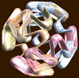 Keywords: mathematica 3d cg parametricplot3d texture torus 輪環 りんかん ドーナツ どーなつ 八芒星 はちぼうせい 八光星 はちこうせい 八稜星 はちりょうせい code program algorithm コード プログラム アルゴリズム geometric sculpture geometricsculpture shape geometry sculpture mapping テクスチャ マッピング 模様 もよう abstract 抽象 ちゅうしょう アブストラクト design pattern デザイン パターン graphic グラフィック グラフィクス structure 意匠 構造 symmetry 対称性 たいしょうせい シンメトリー 対称 たいしょう algorithm コード surreal indoor a = 8;(*center hole size of a torus*) b = 8;(*octa-torus*) c = -12;(*distance from the center of rotation*) d = 4;(*number of torus*) h = 2;(*height of a torus*) SetOptions[ParametricPlot3D, PlotRange -> Full, Mesh -> None, Boxed -> False, Axes -> False, PlotPoints -> 400, ImageSize -> 3000, Background -> Darker[Orange, 0.8], PlotStyle -> Table[Directive[Specularity[White, 30], Texture[Import[fullpath]]], {fullpath, {"D:/tmp/861.jpg", "D:/tmp/862.jpg", "D:/tmp/863.jpg", "D:/tmp/86.jpg"}}], TextureCoordinateFunction -> ({#4, #5 2 Pi} &), Lighting -> "Neutral"]; f[v_] := Sin[2 Sin[Sin[Sin[v]]]]; x = (a - Cos[t] - f[b s]) Cos[s + Pi/(2 b)]; y = (a - Cos[t] - f[b s]) Sin[s + Pi/(2 b)]; z = (a - Sin[t] - h f[b s]) + c; rm = Table[{x, y, z}.RotationMatrix[2 i Pi/d, {1, 0, 0}], {i, d}]; ParametricPlot3D[rm, {t, 0, 2 Pi}, {s, 0, 2 Pi}] (*--- The Texture *) a = 8;(*center hole size of a torus*) b = 8;(*octa-torus*) c = -12;(*distance from the center of rotation*) d = 4;(*number of torus*) h = 2;(*height of a torus*) SetOptions[ParametricPlot3D, PlotRange -> Full, Mesh -> None, Boxed -> False, Axes -> False, PlotPoints -> 400, ImageSize -> 3000, Background -> Darker[Orange, 0.8], PlotStyle -> Table[Directive[Specularity[White, 30], Texture[Import[fullpath]]], {fullpath, {"D:/tmp/861.jpg", "D:/tmp/862.jpg", "D:/tmp/863.jpg", "D:/tmp/86.jpg"}}], TextureCoordinateFunction -> ({#4, #5 2 Pi} &), Lighting -> "Neutral"]; f[v_] := Sin[2 Sin[Sin[Sin[v]]]]; x = (a - Cos[t] - f[b s]) Cos[s + Pi/(2 b)]; y = (a - Cos[t] - f[b s]) Sin[s + Pi/(2 b)]; z = (a - Sin[t] - h f[b s]) + c; rm = Table[{x, y, z}.RotationMatrix[2 i Pi/d, {1, 0, 0}], {i, d}]; ParametricPlot3D[rm, {t, 0, 2 Pi}, {s, 0, 2 Pi}] (*--- The Texture *) |