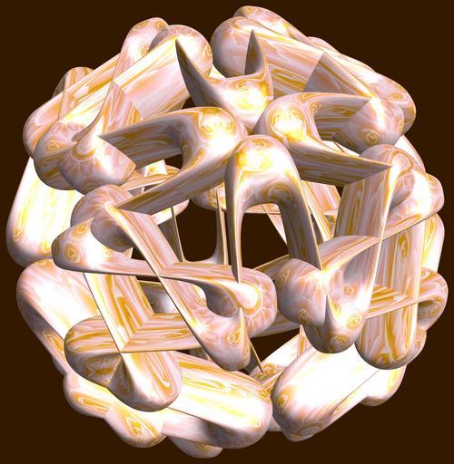 Keywords: mathematica 3d cg parametricplot3d texture torus 輪環 りんかん ドーナツ どーなつ 八芒星 はちぼうせい 八光星 はちこうせい 八稜星 はちりょうせい code program algorithm コード プログラム アルゴリズム geometric sculpture geometricsculpture shape geometry sculpture mapping テクスチャ マッピング 模様 もよう abstract 抽象 ちゅうしょう アブストラクト design pattern デザイン パターン graphic グラフィック グラフィクス structure 意匠 構造 symmetry 対称性 たいしょうせい シンメトリー 対称 たいしょう algorithm コード black background a = 5; (* center hole size of a torus *) b = 8; (* octa-torus *) c = -8; (* distance from the center of rotation *) d = 4; (* number of torus *) h = 2; (* height of a torus *) SetOptions[ParametricPlot3D, PlotRange -> Full, Mesh -> None, Boxed -> False, Axes -> False, PlotPoints -> 400, ImageSize -> 3000, Background -> Darker[Orange, 0.8], PlotStyle -> Directive[Specularity[White, 30], Texture[Import["D:/tmp/861.jpg"]]], TextureCoordinateFunction -> ({#4, #5 2 Pi} &), Lighting -> "Neutral"]; f[v_] := Sin[2 Sin[Sin[Sin[v]]]]; x = (a - Cos[t] - f[b s]) Cos[s + Pi/(2 b)]; y = (a - Cos[t] - f[b s]) Sin[s + Pi/(2 b)]; z = (a - Sin[t] - h f[b s]) + c; rm = Table[{x, y, z}.RotationMatrix[2 i Pi/d, {1, 0, 0}], {i, d}]; ParametricPlot3D[rm, {t, 0, 2 Pi}, {s, 0, 2 Pi}] (*--- The Texture *) a = 5; (* center hole size of a torus *) b = 8; (* octa-torus *) c = -8; (* distance from the center of rotation *) d = 4; (* number of torus *) h = 2; (* height of a torus *) SetOptions[ParametricPlot3D, PlotRange -> Full, Mesh -> None, Boxed -> False, Axes -> False, PlotPoints -> 400, ImageSize -> 3000, Background -> Darker[Orange, 0.8], PlotStyle -> Directive[Specularity[White, 30], Texture[Import["D:/tmp/861.jpg"]]], TextureCoordinateFunction -> ({#4, #5 2 Pi} &), Lighting -> "Neutral"]; f[v_] := Sin[2 Sin[Sin[Sin[v]]]]; x = (a - Cos[t] - f[b s]) Cos[s + Pi/(2 b)]; y = (a - Cos[t] - f[b s]) Sin[s + Pi/(2 b)]; z = (a - Sin[t] - h f[b s]) + c; rm = Table[{x, y, z}.RotationMatrix[2 i Pi/d, {1, 0, 0}], {i, d}]; ParametricPlot3D[rm, {t, 0, 2 Pi}, {s, 0, 2 Pi}] (*--- The Texture *) |