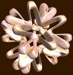 Keywords: mathematica 3d cg parametricplot3d texture torus 輪環 りんかん ドーナツ どーなつ 八芒星 はちぼうせい 八光星 はちこうせい 八稜星 はちりょうせい code program algorithm コード プログラム アルゴリズム geometric sculpture geometricsculpture shape geometry sculpture mapping テクスチャ マッピング 模様 もよう abstract 抽象 ちゅうしょう アブストラクト design pattern デザイン パターン graphic グラフィック グラフィクス structure 意匠 構造 symmetry 対称性 たいしょうせい シンメトリー 対称 たいしょう algorithm コード black background pastel serene a = 5; (* center hole size of a torus *) b = 8; (* octa-torus *) c = -1; (* distance from the center of rotation *) d = 4; (* number of torus *) h = 2; (* height of a torus *) SetOptions[ParametricPlot3D, PlotRange -> Full, Mesh -> None, Boxed -> False, Axes -> False, PlotPoints -> 400, ImageSize -> 3000, Background -> Darker[Orange, 0.8], PlotStyle -> Directive[Specularity[White, 30], Texture[Import["D:/tmp/861.jpg"]]], TextureCoordinateFunction -> ({#4, #5 2 Pi} &), Lighting -> "Neutral"]; f[v_] := Sin[2 Sin[Sin[Sin[v]]]]; x = (a - Cos[t] - f[b s]) Cos[s + Pi/(2 b)]; y = (a - Cos[t] - f[b s]) Sin[s + Pi/(2 b)]; z = (a - Sin[t] - h f[b s]) + c; rm = Table[{x, y, z}.RotationMatrix[2 i Pi/d, {1, 0, 0}], {i, d}]; ParametricPlot3D[rm, {t, 0, 2 Pi}, {s, 0, 2 Pi}] (*--- The Texture *) a = 5; (* center hole size of a torus *) b = 8; (* octa-torus *) c = -1; (* distance from the center of rotation *) d = 4; (* number of torus *) h = 2; (* height of a torus *) SetOptions[ParametricPlot3D, PlotRange -> Full, Mesh -> None, Boxed -> False, Axes -> False, PlotPoints -> 400, ImageSize -> 3000, Background -> Darker[Orange, 0.8], PlotStyle -> Directive[Specularity[White, 30], Texture[Import["D:/tmp/861.jpg"]]], TextureCoordinateFunction -> ({#4, #5 2 Pi} &), Lighting -> "Neutral"]; f[v_] := Sin[2 Sin[Sin[Sin[v]]]]; x = (a - Cos[t] - f[b s]) Cos[s + Pi/(2 b)]; y = (a - Cos[t] - f[b s]) Sin[s + Pi/(2 b)]; z = (a - Sin[t] - h f[b s]) + c; rm = Table[{x, y, z}.RotationMatrix[2 i Pi/d, {1, 0, 0}], {i, d}]; ParametricPlot3D[rm, {t, 0, 2 Pi}, {s, 0, 2 Pi}] (*--- The Texture *) |