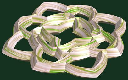 | Keywords: mathematica 3d cg parametricplot3d texture torus code program algorithm プログラム コード アルゴリズム 輪環 りんかん ドーナツ どーなつ 五芒星 ごぼうせい geometric sculpture geometricsculpture shape geometry sculpture mapping テクスチャ マッピング 模様 もよう abstract 抽象 ちゅうしょう アブストラクト design pattern デザイン パターン graphic グラフィック グラフィクス structure 意匠 構造 symmetry 対称性 たいしょうせい シンメトリー 対称 たいしょう black background pastel indoor a = 6; (* center hole size *) b = 5; (* penta-torus *) c = 2; (* distance from the center of rotation *) d = 4; (* number of torus *) h = 0; (* height of a torus *) SetOptions[ParametricPlot3D, PlotRange -> Full, Mesh -> None, Boxed -> False, Axes -> False, PlotPoints -> 400, ImageSize -> 3000, Background -> RGBColor[{20, 50, 30}/255], PlotStyle -> Directive[Specularity[White, 70], Texture[Import["D:/tmp/862.jpg"]]], TextureCoordinateFunction -> ({#4 + #5, #5 / Pi} &), Lighting -> "Neutral"]; f[v_] := TriangleWave[{-1, 1}, v/(2 Pi)]; g[v_] := TriangleWave[{-1, 1}, v/(2 Pi) + 1/4]; x = (a - g[t] - f[b s]) Cos[s] + c; y = (a - g[t] - f[b s]) Sin[s] + c; z = (a - f[t] - h f[b s]); rm = Table[{x, y, z}.RotationMatrix[2 i Pi/d, {0, 0, 1}], {i, d}]; ParametricPlot3D[rm, {t, 0, 2 Pi}, {s, 0, Pi}] (*--- The Texture *) a = 6; (* center hole size *) b = 5; (* penta-torus *) c = 2; (* distance from the center of rotation *) d = 4; (* number of torus *) h = 0; (* height of a torus *) SetOptions[ParametricPlot3D, PlotRange -> Full, Mesh -> None, Boxed -> False, Axes -> False, PlotPoints -> 400, ImageSize -> 3000, Background -> RGBColor[{20, 50, 30}/255], PlotStyle -> Directive[Specularity[White, 70], Texture[Import["D:/tmp/862.jpg"]]], TextureCoordinateFunction -> ({#4 + #5, #5 / Pi} &), Lighting -> "Neutral"]; f[v_] := TriangleWave[{-1, 1}, v/(2 Pi)]; g[v_] := TriangleWave[{-1, 1}, v/(2 Pi) + 1/4]; x = (a - g[t] - f[b s]) Cos[s] + c; y = (a - g[t] - f[b s]) Sin[s] + c; z = (a - f[t] - h f[b s]); rm = Table[{x, y, z}.RotationMatrix[2 i Pi/d, {0, 0, 1}], {i, d}]; ParametricPlot3D[rm, {t, 0, 2 Pi}, {s, 0, Pi}] (*--- The Texture *) |