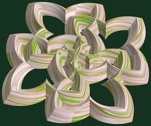 Keywords: mathematica 3d cg parametricplot3d texture torus code program algorithm プログラム コード アルゴリズム 輪環 りんかん ドーナツ どーなつ 四芒星 しぼうせい geometric sculpture geometricsculpture shape geometry sculpture abstract 抽象 ちゅうしょう アブストラクト design pattern デザイン パターン graphic グラフィック グラフィクス structure 意匠 構造 symmetry 対称性 たいしょうせい シンメトリー 対称 たいしょう indoor pastel a = 3; (* center hole size *) b = 4; (* tetra-torus *) c = 2; (* distance from the center of rotation *) d = 4; (* number of torus *) h = 0; (* height of a torus *) SetOptions[ParametricPlot3D, PlotRange -> Full, Mesh -> None, Boxed -> False, Axes -> False, PlotPoints -> 400, ImageSize -> 3000, Background -> RGBColor[{20, 50, 30}/255], PlotStyle -> Directive[Specularity[White, 70], Texture[Import["D:/tmp/862.jpg"]]], TextureCoordinateFunction -> ({#4 + #5, #5 / Pi} &), Lighting -> "Neutral"]; f[v_] := TriangleWave[{-1, 1}, v/(2 Pi)]; g[v_] := TriangleWave[{-1, 1}, v/(2 Pi) + 1/4]; x = (a - g[t] - f[b s]) Cos[s] + c; y = (a - g[t] - f[b s]) Sin[s] + c; z = (a - f[t] - h f[b s]); rm = Table[{x, y, z}.RotationMatrix[2 i Pi/d, {0, 0, 1}], {i, d}]; ParametricPlot3D[rm, {t, 0, 2 Pi}, {s, 0, Pi}] (*--- The Texture *) a = 3; (* center hole size *) b = 4; (* tetra-torus *) c = 2; (* distance from the center of rotation *) d = 4; (* number of torus *) h = 0; (* height of a torus *) SetOptions[ParametricPlot3D, PlotRange -> Full, Mesh -> None, Boxed -> False, Axes -> False, PlotPoints -> 400, ImageSize -> 3000, Background -> RGBColor[{20, 50, 30}/255], PlotStyle -> Directive[Specularity[White, 70], Texture[Import["D:/tmp/862.jpg"]]], TextureCoordinateFunction -> ({#4 + #5, #5 / Pi} &), Lighting -> "Neutral"]; f[v_] := TriangleWave[{-1, 1}, v/(2 Pi)]; g[v_] := TriangleWave[{-1, 1}, v/(2 Pi) + 1/4]; x = (a - g[t] - f[b s]) Cos[s] + c; y = (a - g[t] - f[b s]) Sin[s] + c; z = (a - f[t] - h f[b s]); rm = Table[{x, y, z}.RotationMatrix[2 i Pi/d, {0, 0, 1}], {i, d}]; ParametricPlot3D[rm, {t, 0, 2 Pi}, {s, 0, Pi}] (*--- The Texture *) |
