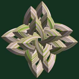 Keywords: mathematica 3d cg parametricplot3d texture torus code program algorithm プログラム コード アルゴリズム 輪環 りんかん ドーナツ どーなつ 四芒星 しぼうせい geometric sculpture geometricsculpture shape geometry sculpture mapping テクスチャ マッピング 模様 もよう abstract 抽象 ちゅうしょう アブストラクト design pattern デザイン パターン graphic グラフィック グラフィクス structure 意匠 構造 symmetry 対称性 たいしょうせい シンメトリー 対称 たいしょう black background pastel a = 3; (* center hole size *) b = 4; (* tetra-torus *) c = 1; (* distance from the center of rotation *) d = 4; (* number of torus *) h = 3; (* height of a torus *) SetOptions[ParametricPlot3D, PlotRange -> Full, Mesh -> None, Boxed -> False, Axes -> False, PlotPoints -> 400, ImageSize -> 3000, Background -> RGBColor[{20, 50, 30}/255], PlotStyle -> Directive[Specularity[White, 70], Texture[Import["D:/tmp/862.jpg"]]], TextureCoordinateFunction -> ({#4 + #5, #5 / Pi} &), Lighting -> "Neutral"]; f[v_] := TriangleWave[{-1, 1}, v/(2 Pi)]; g[v_] := TriangleWave[{-1, 1}, v/(2 Pi) + 1/4]; x = (a - g[t] - f[b s]) Cos[s] + c; y = (a - g[t] - f[b s]) Sin[s] + c; z = (a - f[t] - h f[b s]); rm = Table[{x, y, z}.RotationMatrix[2 i Pi/d, {0, 0, 1}], {i, d}]; ParametricPlot3D[rm, {t, 0, 2 Pi}, {s, 0, Pi}] (*--- The Texture *) a = 3; (* center hole size *) b = 4; (* tetra-torus *) c = 1; (* distance from the center of rotation *) d = 4; (* number of torus *) h = 3; (* height of a torus *) SetOptions[ParametricPlot3D, PlotRange -> Full, Mesh -> None, Boxed -> False, Axes -> False, PlotPoints -> 400, ImageSize -> 3000, Background -> RGBColor[{20, 50, 30}/255], PlotStyle -> Directive[Specularity[White, 70], Texture[Import["D:/tmp/862.jpg"]]], TextureCoordinateFunction -> ({#4 + #5, #5 / Pi} &), Lighting -> "Neutral"]; f[v_] := TriangleWave[{-1, 1}, v/(2 Pi)]; g[v_] := TriangleWave[{-1, 1}, v/(2 Pi) + 1/4]; x = (a - g[t] - f[b s]) Cos[s] + c; y = (a - g[t] - f[b s]) Sin[s] + c; z = (a - f[t] - h f[b s]); rm = Table[{x, y, z}.RotationMatrix[2 i Pi/d, {0, 0, 1}], {i, d}]; ParametricPlot3D[rm, {t, 0, 2 Pi}, {s, 0, Pi}] (*--- The Texture *) |