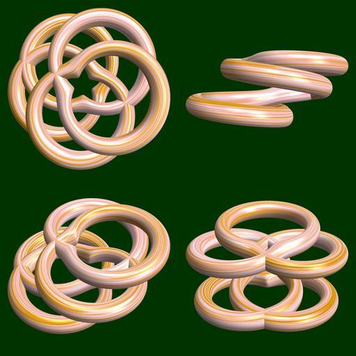 Keywords: mathematica 3d cg parametricplot3d texture torus 輪環 りんかん ドーナツ どーなつ トーラス code program コード プログラム algorithm コード アルゴリズム geometric sculpture geometricsculpture shape geometry sculpture mapping テクスチャ マッピング 模様 もよう abstract 抽象 ちゅうしょう アブストラクト design pattern デザイン パターン graphic グラフィック グラフィクス structure 意匠 構造 symmetry 対称性 たいしょうせい シンメトリー 対称 たいしょう algorithm bright black background tangle curve a = 5; (* center hole size of a torus *) b1 = 5; (* number of cross *) b2 = 4; (* number of cross *) w = 3; (* gap width *) SetOptions[ParametricPlot3D, PlotRange -> Full, Mesh -> None, Boxed -> False, Axes -> None, PlotPoints -> 500, ImageSize -> 1600, Background -> Darker[Green, 0.8], PlotStyle -> Directive[Specularity[White, 90], Texture[Import["D:/tmp/861.jpg"]]], TextureCoordinateFunction -> ({#4 + #5, #5 / Pi} &), Lighting -> "Neutral"]; x = (a - Cos[t] + w Sin[b1 s]) Cos[b2 s]; y = (a - Cos[t] + w Sin[b1 s]) Sin[b2 s]; z = w Sin[s] + Sin[t]; ParametricPlot3D[{x, y, z}, {t, 0, 2 Pi}, {s, 0, 2 Pi}] (*--- The Texture is this: www.flickr.com/photos/tanaka_juuyoh/5412528282/ *) a = 5; (* center hole size of a torus *) b1 = 5; (* number of cross *) b2 = 4; (* number of cross *) w = 3; (* gap width *) SetOptions[ParametricPlot3D, PlotRange -> Full, Mesh -> None, Boxed -> False, Axes -> None, PlotPoints -> 500, ImageSize -> 1600, Background -> Darker[Green, 0.8], PlotStyle -> Directive[Specularity[White, 90], Texture[Import["D:/tmp/861.jpg"]]], TextureCoordinateFunction -> ({#4 + #5, #5 / Pi} &), Lighting -> "Neutral"]; x = (a - Cos[t] + w Sin[b1 s]) Cos[b2 s]; y = (a - Cos[t] + w Sin[b1 s]) Sin[b2 s]; z = w Sin[s] + Sin[t]; ParametricPlot3D[{x, y, z}, {t, 0, 2 Pi}, {s, 0, 2 Pi}] (*--- The Texture is this: www.flickr.com/photos/tanaka_juuyoh/5412528282/ *) |