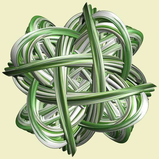 Keywords: mathematica 3d cg parametricplot3d texture torus code program algorithm プログラム コード アルゴリズム 輪環 りんかん ドーナツ どーなつ トーラス とーらす knot 結び目 むすびめ mapping テクスチャ マッピング 模様 もよう design pattern デザイン パターン graphic グラフィック グラフィクス structure 意匠 構造 symmetry 対称性 たいしょうせい シンメトリー 対称 たいしょう white background a = 6; (* center hole size of a torus *) b1 = 5;(* the number of angles *) b2 = 4;(* the number of waves *) b3 = 6; (* the number of knots *) c = 1; (* distance from the center of rotation *) d = 4; (* the number of tori *) h1 = 2; (* width of a torus *) h2 = 2; (* width of a torus *) h3 = 15; (* height of cross *) SetOptions[ParametricPlot3D, PlotRange -> Full, Mesh -> None, Boxed -> False, Axes -> None, PlotPoints -> 500, ImageSize -> 3000, Background -> RGBColor[{240, 240, 200}/255], PlotStyle -> Directive[Specularity[White, 50], Texture[Import["D:/tmp/911.jpg"]]], TextureCoordinateFunction -> ({#4, #5 /Pi} &), Lighting -> "Neutral"]; x = (a - h1 Cos[t] + h2 Sin[b1 s]) Cos[b3 s] + c; y = (a - h1 Cos[t] + h2 Sin[b1 s]) Sin[b3 s] + c; z = h3 Cos[b1 s] + Sin[b2 t] + c; rm = Table[{x, y, z}.RotationMatrix[2 i Pi/d, {1, 1, 0}], {i, d}]; ParametricPlot3D[rm, {t, 0, 2 Pi}, {s, 0, 2 Pi}] (*--- The Texture Another shapes and colors *) a = 6; (* center hole size of a torus *) b1 = 5;(* the number of angles *) b2 = 4;(* the number of waves *) b3 = 6; (* the number of knots *) c = 1; (* distance from the center of rotation *) d = 4; (* the number of tori *) h1 = 2; (* width of a torus *) h2 = 2; (* width of a torus *) h3 = 15; (* height of cross *) SetOptions[ParametricPlot3D, PlotRange -> Full, Mesh -> None, Boxed -> False, Axes -> None, PlotPoints -> 500, ImageSize -> 3000, Background -> RGBColor[{240, 240, 200}/255], PlotStyle -> Directive[Specularity[White, 50], Texture[Import["D:/tmp/911.jpg"]]], TextureCoordinateFunction -> ({#4, #5 /Pi} &), Lighting -> "Neutral"]; x = (a - h1 Cos[t] + h2 Sin[b1 s]) Cos[b3 s] + c; y = (a - h1 Cos[t] + h2 Sin[b1 s]) Sin[b3 s] + c; z = h3 Cos[b1 s] + Sin[b2 t] + c; rm = Table[{x, y, z}.RotationMatrix[2 i Pi/d, {1, 1, 0}], {i, d}]; ParametricPlot3D[rm, {t, 0, 2 Pi}, {s, 0, 2 Pi}] (*--- The Texture Another shapes and colors *) |
