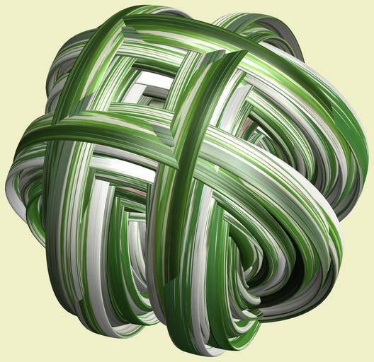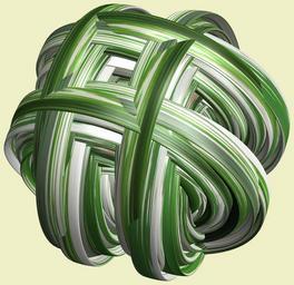 Keywords: mathematica 3d cg parametricplot3d texture torus code program algorithm プログラム コード アルゴリズム 輪環 りんかん ドーナツ どーなつ トーラス とーらす knot 結び目 むすびめ mapping テクスチャ マッピング 模様 もよう design pattern デザイン パターン graphic グラフィック グラフィクス structure 意匠 構造 symmetry 対称性 たいしょうせい シンメトリー 対称 たいしょう indoor white background a = 6; (* center hole size of a torus *) b1 = 5;(* the number of angles *) b2 = 4;(* the number of waves *) b3 = 6; (* the number of knots *) c = 3; (* distance from the center of rotation *) d = 4; (* the number of tori *) h1 = 2; (* width of a torus *) h2 = 2; (* width of a torus *) h3 = 1; (* height of cross *) SetOptions[ParametricPlot3D, PlotRange -> Full, Mesh -> None, Boxed -> False, Axes -> None, PlotPoints -> 500, ImageSize -> 3000, Background -> RGBColor[{240, 240, 200}/255], PlotStyle -> Directive[Specularity[White, 50], Texture[Import["D:/tmp/911.jpg"]]], TextureCoordinateFunction -> ({#4, #5 /Pi} &), Lighting -> "Neutral"]; x = (a - h1 Cos[t] + h2 Sin[b1 s]) Cos[b3 s] + c; y = (a - h1 Cos[t] + h2 Sin[b1 s]) Sin[b3 s] + c; z = h3 Cos[b1 s] + Sin[b2 t] + c; rm = Table[{x, y, z}.RotationMatrix[2 i Pi/d, {1, 1, 0}], {i, d}]; ParametricPlot3D[rm, {t, 0, 2 Pi}, {s, 0, 2 Pi}] (*--- The Texture *) a = 6; (* center hole size of a torus *) b1 = 5;(* the number of angles *) b2 = 4;(* the number of waves *) b3 = 6; (* the number of knots *) c = 3; (* distance from the center of rotation *) d = 4; (* the number of tori *) h1 = 2; (* width of a torus *) h2 = 2; (* width of a torus *) h3 = 1; (* height of cross *) SetOptions[ParametricPlot3D, PlotRange -> Full, Mesh -> None, Boxed -> False, Axes -> None, PlotPoints -> 500, ImageSize -> 3000, Background -> RGBColor[{240, 240, 200}/255], PlotStyle -> Directive[Specularity[White, 50], Texture[Import["D:/tmp/911.jpg"]]], TextureCoordinateFunction -> ({#4, #5 /Pi} &), Lighting -> "Neutral"]; x = (a - h1 Cos[t] + h2 Sin[b1 s]) Cos[b3 s] + c; y = (a - h1 Cos[t] + h2 Sin[b1 s]) Sin[b3 s] + c; z = h3 Cos[b1 s] + Sin[b2 t] + c; rm = Table[{x, y, z}.RotationMatrix[2 i Pi/d, {1, 1, 0}], {i, d}]; ParametricPlot3D[rm, {t, 0, 2 Pi}, {s, 0, 2 Pi}] (*--- The Texture *) |