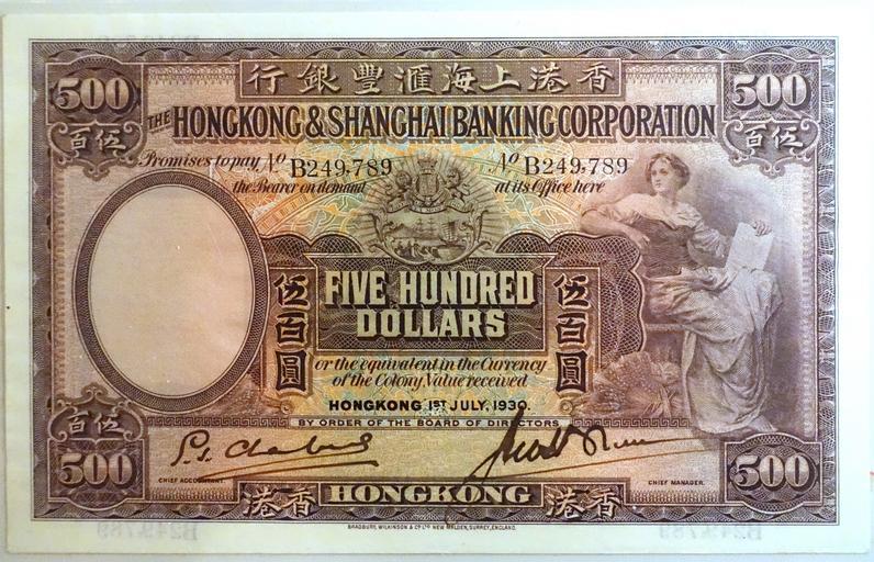 Keywords: 500 dollar note, Hong Kong & Shanghai Banking Corporation, 1930 - Hong Kong Museum of History - DSC01016.JPG en Exhibit in the Hong Kong Museum of History Hong Kong Photography was permitted in the museum without restriction 2014-07-27 02 43 56 own Daderot other versions cc-zero Currency in the Hong Kong Museum of History Uploaded with UploadWizard HSBC in Hong Kong Banknotes of Hong Kong Banknotes with a face value of 500 |