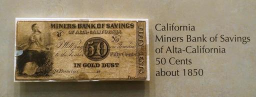 Keywords: 50 Cents, Miners Bank of Alta-California, c. 1850 - National Museum of American History - DSC00210.jpg en Exhibit in the National Museum of American History Washington DC USA Photography was permitted in the museum without restriction 2015-03-27 11 31 02 own Daderot other versions cc-zero Banknotes in the National Museum of American History Local currencies of the United States |