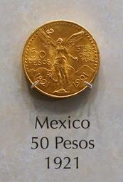 Keywords: 50 Pesos, Mexico, 1921 - National Museum of American History - DSC00266.jpg en Exhibit in the National Museum of American History Washington DC USA Photography was permitted in the museum without restriction 2015-03-27 11 37 23 own Daderot other versions cc-zero Coins in the National Museum of American History Gold coins of Mexico |