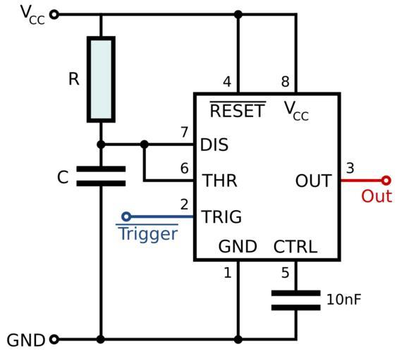 Keywords: 555 Monostable.svg 555 timer IC A low pulse on the overline trigger line starts the monostable own Inductiveload 2009-06-23 555 timer IC Monostable circuits with 555 timer