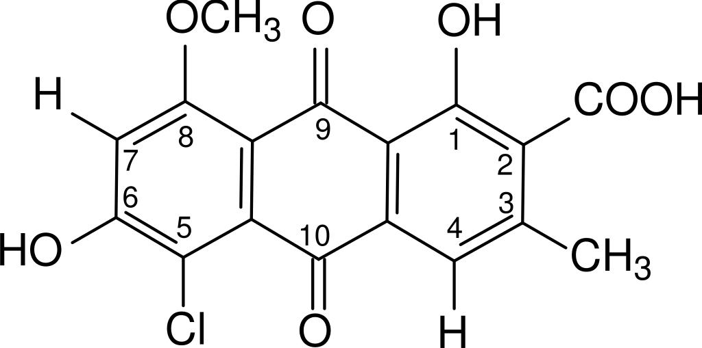 Keywords: 5-Chlorodermolutein.svg Structure of 5-Chlorodermolutein a pigment of some Dermocybe species like Cortinarius cinnamoneus own Created with Bkchem and Inkscape 2016-03-04 User Thkgk Cc-zero Anthraquinones Cortinarius pigments