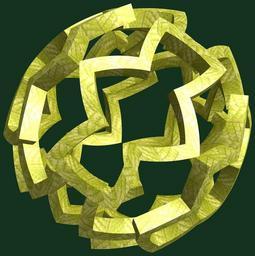 Keywords: mathematica 3d cg parametricplot3d texture torus code program algorithm プログラム コード アルゴリズム 輪環 りんかん ドーナツ どーなつ 八芒星 はちぼうせい geometric sculpture geometricsculpture shape geometry sculpture mapping テクスチャ マッピング 模様 もよう abstract 抽象 ちゅうしょう アブストラクト design pattern デザイン パターン graphic グラフィック グラフィクス structure 意匠 構造 symmetry 対称性 たいしょうせい シンメトリー 対称 たいしょう ancient a = 8; (* center hole size *) b = 8; (* octa-torus *) c = -13; (* distance from the center of rotation *) d = 5; (* number of torus *) h = 1; (* height of a torus *) SetOptions[ParametricPlot3D, PlotRange -> Full, Mesh -> None, Boxed -> False, Axes -> False, PlotPoints -> 400, ImageSize -> 3000, Background -> RGBColor[{20, 50, 30}/255], PlotStyle -> Directive[Specularity[White, 30], Texture[Import["D:/tmp/71.jpg"]]], TextureCoordinateFunction -> ({#4, #5 Pi} &), Lighting -> "Neutral"]; f[v_] := TriangleWave[{-1, 1}, v/(2 Pi)]; g[v_] := TriangleWave[{-1, 1}, v/(2 Pi) + 1/4]; x = (a - g[t] - f[b s]) Cos[s + Pi/(2 b)]; y = (a - g[t] - f[b s]) Sin[s + Pi/(2 b)]; z = (a - f[t] - h f[b s]) + c; rm = Table[{x, y, z}.RotationMatrix[2 i Pi/d, {1, 1, 0}], {i, d}]; ParametricPlot3D[rm, {t, 0, 2 Pi}, {s, 0, Pi}] (*--- The Texture *) a = 8; (* center hole size *) b = 8; (* octa-torus *) c = -13; (* distance from the center of rotation *) d = 5; (* number of torus *) h = 1; (* height of a torus *) SetOptions[ParametricPlot3D, PlotRange -> Full, Mesh -> None, Boxed -> False, Axes -> False, PlotPoints -> 400, ImageSize -> 3000, Background -> RGBColor[{20, 50, 30}/255], PlotStyle -> Directive[Specularity[White, 30], Texture[Import["D:/tmp/71.jpg"]]], TextureCoordinateFunction -> ({#4, #5 Pi} &), Lighting -> "Neutral"]; f[v_] := TriangleWave[{-1, 1}, v/(2 Pi)]; g[v_] := TriangleWave[{-1, 1}, v/(2 Pi) + 1/4]; x = (a - g[t] - f[b s]) Cos[s + Pi/(2 b)]; y = (a - g[t] - f[b s]) Sin[s + Pi/(2 b)]; z = (a - f[t] - h f[b s]) + c; rm = Table[{x, y, z}.RotationMatrix[2 i Pi/d, {1, 1, 0}], {i, d}]; ParametricPlot3D[rm, {t, 0, 2 Pi}, {s, 0, Pi}] (*--- The Texture *) |