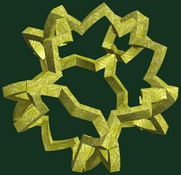 Keywords: mathematica 3d cg parametricplot3d texture torus code program algorithm プログラム コード アルゴリズム 輪環 りんかん ドーナツ どーなつ 八芒星 はちぼうせい geometric sculpture geometricsculpture shape geometry sculpture mapping テクスチャ マッピング 模様 もよう abstract 抽象 ちゅうしょう アブストラクト design pattern デザイン パターン graphic グラフィック グラフィクス structure 意匠 構造 symmetry 対称性 たいしょうせい シンメトリー 対称 たいしょう plant foliage leaf ancient organic pattern outdoor black background tree a = 8; (* center hole size *) b = 8; (* octa-torus *) c = -1; (* distance from the center of rotation *) d = 5; (* number of torus *) h = 1; (* height of a torus *) SetOptions[ParametricPlot3D, PlotRange -> Full, Mesh -> None, Boxed -> False, Axes -> False, PlotPoints -> 400, ImageSize -> 3000, Background -> RGBColor[{20, 50, 30}/255], PlotStyle -> Directive[Specularity[White, 30], Texture[Import["D:/tmp/71.jpg"]]], TextureCoordinateFunction -> ({#4, #5 Pi} &), Lighting -> "Neutral"]; f[v_] := TriangleWave[{-1, 1}, v/(2 Pi)]; g[v_] := TriangleWave[{-1, 1}, v/(2 Pi) + 1/4]; x = (a - g[t] - f[b s]) Cos[s + Pi/(2 b)]; y = (a - g[t] - f[b s]) Sin[s + Pi/(2 b)]; z = (a - f[t] - h f[b s]) + c; rm = Table[{x, y, z}.RotationMatrix[2 i Pi/d, {1, 1, 0}], {i, d}]; ParametricPlot3D[rm, {t, 0, 2 Pi}, {s, 0, Pi}] (*--- The Texture *) a = 8; (* center hole size *) b = 8; (* octa-torus *) c = -1; (* distance from the center of rotation *) d = 5; (* number of torus *) h = 1; (* height of a torus *) SetOptions[ParametricPlot3D, PlotRange -> Full, Mesh -> None, Boxed -> False, Axes -> False, PlotPoints -> 400, ImageSize -> 3000, Background -> RGBColor[{20, 50, 30}/255], PlotStyle -> Directive[Specularity[White, 30], Texture[Import["D:/tmp/71.jpg"]]], TextureCoordinateFunction -> ({#4, #5 Pi} &), Lighting -> "Neutral"]; f[v_] := TriangleWave[{-1, 1}, v/(2 Pi)]; g[v_] := TriangleWave[{-1, 1}, v/(2 Pi) + 1/4]; x = (a - g[t] - f[b s]) Cos[s + Pi/(2 b)]; y = (a - g[t] - f[b s]) Sin[s + Pi/(2 b)]; z = (a - f[t] - h f[b s]) + c; rm = Table[{x, y, z}.RotationMatrix[2 i Pi/d, {1, 1, 0}], {i, d}]; ParametricPlot3D[rm, {t, 0, 2 Pi}, {s, 0, Pi}] (*--- The Texture *) |