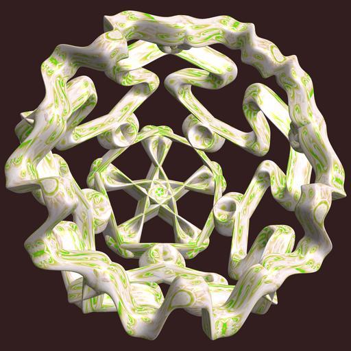 Keywords: mathematica 3d cg parametricplot3d texture torus 輪環 りんかん ドーナツ どーなつ 八芒星 はちぼうせい 八光星 はちこうせい 八稜星 はちりょうせい code program algorithm コード プログラム アルゴリズム geometric sculpture geometricsculpture shape geometry sculpture mapping テクスチャ マッピング 模様 もよう abstract 抽象 ちゅうしょう アブストラクト design pattern デザイン パターン graphic グラフィック グラフィクス structure 意匠 構造 symmetry 対称性 たいしょうせい シンメトリー 対称 たいしょう algorithm コード black background organic pattern a = 8; (* center hole size of a torus *) b = 8; (* octa-torus *) c = -8; (* distance from the center of rotation *) d = 5; (* number of torus *) h = 2; (* height of a torus *) SetOptions[ParametricPlot3D, PlotRange -> Full, Mesh -> None, Boxed -> False, Axes -> False, PlotPoints -> 400, ImageSize -> 3000, Background -> RGBColor[{50, 30, 30}/255], PlotStyle -> Directive[Specularity[White, 70], Texture[Import["D:/tmp/864.jpg"]]], TextureCoordinateFunction -> ({#4, #5 2 Pi} &), Lighting -> "Neutral"]; f[v_] := Sin[2 Sin[Sin[Sin[v]]]]; x = (a - Cos[t] - Sin[b s]) Cos[s + Pi/(2 b)]; y = (a - Cos[t] - Sin[b s]) Sin[s + Pi/(2 b)]; z = (f[t] - h f[b s]) + c; rm = Table[{x, y, z}.RotationMatrix[2 i Pi/d, {1, 1, 1}], {i, d}]; ParametricPlot3D[rm, {t, 0, 2 Pi}, {s, 0, 2 Pi}] (*--- The Texture *) a = 8; (* center hole size of a torus *) b = 8; (* octa-torus *) c = -8; (* distance from the center of rotation *) d = 5; (* number of torus *) h = 2; (* height of a torus *) SetOptions[ParametricPlot3D, PlotRange -> Full, Mesh -> None, Boxed -> False, Axes -> False, PlotPoints -> 400, ImageSize -> 3000, Background -> RGBColor[{50, 30, 30}/255], PlotStyle -> Directive[Specularity[White, 70], Texture[Import["D:/tmp/864.jpg"]]], TextureCoordinateFunction -> ({#4, #5 2 Pi} &), Lighting -> "Neutral"]; f[v_] := Sin[2 Sin[Sin[Sin[v]]]]; x = (a - Cos[t] - Sin[b s]) Cos[s + Pi/(2 b)]; y = (a - Cos[t] - Sin[b s]) Sin[s + Pi/(2 b)]; z = (f[t] - h f[b s]) + c; rm = Table[{x, y, z}.RotationMatrix[2 i Pi/d, {1, 1, 1}], {i, d}]; ParametricPlot3D[rm, {t, 0, 2 Pi}, {s, 0, 2 Pi}] (*--- The Texture *) |