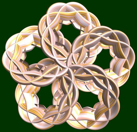 Keywords: mathematica 3d cg parametricplot3d texture torus 輪環 りんかん ドーナツ どーなつ 八芒星 はちぼうせい 八光星 はちこうせい 八稜星 はちりょうせい program プログラム code コード algorithm コード アルゴリズム geometric sculpture geometricsculpture shape geometry sculpture mapping テクスチャ マッピング 模様 もよう abstract 抽象 ちゅうしょう アブストラクト design pattern デザイン パターン graphic グラフィック グラフィクス structure 意匠 構造 symmetry 対称性 たいしょうせい シンメトリー 対称 たいしょう algorithm tangle bright organic pattern black background SetOptions[ParametricPlot3D, PlotRange -> Full, Mesh -> None, Boxed -> False, Axes -> None, PlotPoints -> 400, ImageSize -> 3000, Background -> Darker[Green, 0.8], PlotStyle -> Directive[Specularity[White, 30], Texture[Import["D:/tmp/861.jpg"]]], TextureCoordinateFunction -> ({#4 + #5, #5/Pi} &), Lighting -> "Neutral"]; a = 4; (* center hole size of a torus *) b = 8; (* octa-torus *) c = 5; (* distance from the center of rotation *) d = 5; (* number of torus *) v = 3; w = 0.8; x = (a - Cos[w t] - Sin[b s]) Cos[v s] + c; y = Sin[t] + c; z = (a - Cos[w t] - Sin[b s]) Sin[v s] + c; rot = Table[{x, y, z}.RotationMatrix[2 i Pi/d, {1, 2, 0}], {i, d}]; ParametricPlot3D[rot, {t, 0, 2 Pi}, {s, 0, 2 Pi}] (*--- The Texture Lissajous figure / リサジュー図形(リサジューずけい) b/v が割り切れないと、このように複雑になる *) SetOptions[ParametricPlot3D, PlotRange -> Full, Mesh -> None, Boxed -> False, Axes -> None, PlotPoints -> 400, ImageSize -> 3000, Background -> Darker[Green, 0.8], PlotStyle -> Directive[Specularity[White, 30], Texture[Import["D:/tmp/861.jpg"]]], TextureCoordinateFunction -> ({#4 + #5, #5/Pi} &), Lighting -> "Neutral"]; a = 4; (* center hole size of a torus *) b = 8; (* octa-torus *) c = 5; (* distance from the center of rotation *) d = 5; (* number of torus *) v = 3; w = 0.8; x = (a - Cos[w t] - Sin[b s]) Cos[v s] + c; y = Sin[t] + c; z = (a - Cos[w t] - Sin[b s]) Sin[v s] + c; rot = Table[{x, y, z}.RotationMatrix[2 i Pi/d, {1, 2, 0}], {i, d}]; ParametricPlot3D[rot, {t, 0, 2 Pi}, {s, 0, 2 Pi}] (*--- The Texture Lissajous figure / リサジュー図形(リサジューずけい) b/v が割り切れないと、このように複雑になる *) |