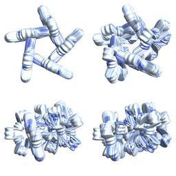 | Keywords: mathematica 3d cg parametricplot3d texture torus 輪環 りんかん ドーナツ どーなつ 五芒星 ごぼうせい 五光星 五稜星 ごこうせい ごりょうせい program プログラム code コード algorithm コード アルゴリズム pentagram geometric sculpture geometricsculpture shape geometry sculpture mapping テクスチャ マッピング 模様 もよう design pattern デザイン パターン graphic グラフィック グラフィクス structure 意匠 構造 symmetry 対称性 たいしょうせい シンメトリー 対称 たいしょう algorithm white background blossom plant SetOptions[ParametricPlot3D, PlotRange -> Full, Mesh -> None, Boxed -> False, Axes -> None, PlotPoints -> 300, ImageSize -> 900, PlotStyle -> Directive[Specularity[White, 30], Texture[Import["D:/tmp/863.jpg"]]], TextureCoordinateFunction -> ({#4 + 2 #5, #5/Pi} &), Lighting -> "Neutral"]; a = 3; (* center hole size of a torus *) b = 5; (* penta-torus *) c = 3; (* distance from the center of rotation *) d = 5; (* number of torus *) f[v_] := Sum[Sin[(2 k - 1) v]/(2 k - 1), {k, 3}]; x = (a - Cos[t] - f[b s]) Cos[s + Pi/(2 b)] + c; y = Sin[t] + c; z = (a - Cos[t] - f[b s]) Sin[s + Pi/(2 b)] + c; rot = Table[{x, y, z}.RotationMatrix[2 i Pi/d, {1, 0, 0}], {i, d}]; ParametricPlot3D[rot, {t, 0, 2 Pi}, {s, 0, 2 Pi}] (*--- The Texture The g[] is a 3-partial sum of the Fourier series for Square wave. g[]は矩形波のフーリエ展開の最初の3項 *) SetOptions[ParametricPlot3D, PlotRange -> Full, Mesh -> None, Boxed -> False, Axes -> None, PlotPoints -> 300, ImageSize -> 900, PlotStyle -> Directive[Specularity[White, 30], Texture[Import["D:/tmp/863.jpg"]]], TextureCoordinateFunction -> ({#4 + 2 #5, #5/Pi} &), Lighting -> "Neutral"]; a = 3; (* center hole size of a torus *) b = 5; (* penta-torus *) c = 3; (* distance from the center of rotation *) d = 5; (* number of torus *) f[v_] := Sum[Sin[(2 k - 1) v]/(2 k - 1), {k, 3}]; x = (a - Cos[t] - f[b s]) Cos[s + Pi/(2 b)] + c; y = Sin[t] + c; z = (a - Cos[t] - f[b s]) Sin[s + Pi/(2 b)] + c; rot = Table[{x, y, z}.RotationMatrix[2 i Pi/d, {1, 0, 0}], {i, d}]; ParametricPlot3D[rot, {t, 0, 2 Pi}, {s, 0, 2 Pi}] (*--- The Texture The g[] is a 3-partial sum of the Fourier series for Square wave. g[]は矩形波のフーリエ展開の最初の3項 *) |