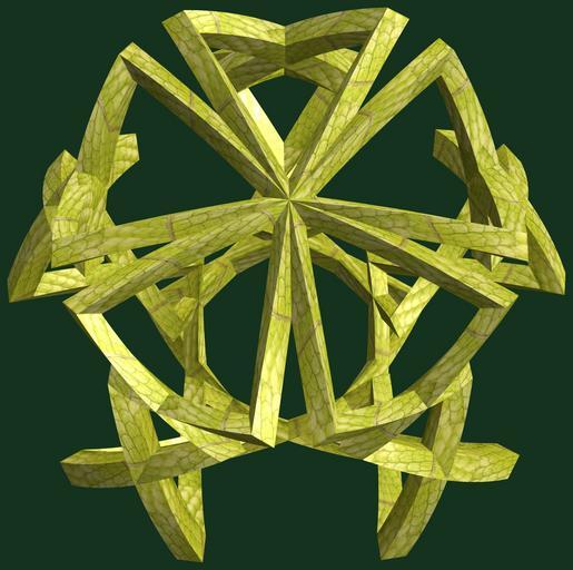 | Keywords: mathematica 3d cg parametricplot3d texture torus code program algorithm プログラム コード アルゴリズム 輪環 りんかん ドーナツ どーなつ 五芒星 ごぼうせい geometric sculpture geometricsculpture shape geometry sculpture mapping テクスチャ マッピング 模様 もよう abstract 抽象 ちゅうしょう アブストラクト design pattern デザイン パターン graphic グラフィック グラフィクス structure 意匠 構造 symmetry 対称性 たいしょうせい シンメトリー 対称 たいしょう outdoor plant foliage organic pattern black background leaf a = 12; (* center hole size *) b = 5; (* penta-torus *) c = -8; (* distance from the center of rotation *) d = 5; (* number of torus *) h = 4; (* height of a torus *) SetOptions[ParametricPlot3D, PlotRange -> Full, Mesh -> None, Boxed -> False, Axes -> False, PlotPoints -> 400, ImageSize -> 3000, Background -> RGBColor[{20, 50, 30}/255], PlotStyle -> Directive[Specularity[White, 30], Texture[Import["D:/tmp/71.jpg"]]], TextureCoordinateFunction -> ({#4, #5 Pi} &), Lighting -> "Neutral"]; f[v_] := TriangleWave[{-1, 1}, v/(2 Pi)]; g[v_] := TriangleWave[{-1, 1}, v/(2 Pi) + 1/4]; x = (a - g[t] - f[b s]) Cos[s + 3 Pi/(4 b)]; y = (a - g[t] - f[b s]) Sin[s + 3 Pi/(4 b)]; z = (a - f[t] - h f[b s]) + c; rm = Table[{x, y, z}.RotationMatrix[2 i Pi/d, {1, 1, 0}], {i, d}]; ParametricPlot3D[rm, {t, 0, 2 Pi}, {s, 0, Pi}] (*--- The Texture *) a = 12; (* center hole size *) b = 5; (* penta-torus *) c = -8; (* distance from the center of rotation *) d = 5; (* number of torus *) h = 4; (* height of a torus *) SetOptions[ParametricPlot3D, PlotRange -> Full, Mesh -> None, Boxed -> False, Axes -> False, PlotPoints -> 400, ImageSize -> 3000, Background -> RGBColor[{20, 50, 30}/255], PlotStyle -> Directive[Specularity[White, 30], Texture[Import["D:/tmp/71.jpg"]]], TextureCoordinateFunction -> ({#4, #5 Pi} &), Lighting -> "Neutral"]; f[v_] := TriangleWave[{-1, 1}, v/(2 Pi)]; g[v_] := TriangleWave[{-1, 1}, v/(2 Pi) + 1/4]; x = (a - g[t] - f[b s]) Cos[s + 3 Pi/(4 b)]; y = (a - g[t] - f[b s]) Sin[s + 3 Pi/(4 b)]; z = (a - f[t] - h f[b s]) + c; rm = Table[{x, y, z}.RotationMatrix[2 i Pi/d, {1, 1, 0}], {i, d}]; ParametricPlot3D[rm, {t, 0, 2 Pi}, {s, 0, Pi}] (*--- The Texture *) |