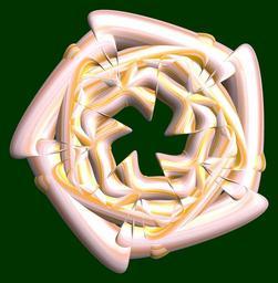 Keywords: mathematica 3d cg parametricplot3d texture torus 輪環 りんかん ドーナツ どーなつ 四芒星 しぼうせい しこうせい 四光星 四稜星 しりょうせい program プログラム code コード algorithm コード アルゴリズム geometric sculpture geometricsculpture shape geometry sculpture mapping テクスチャ マッピング 模様 もよう design pattern デザイン パターン graphic グラフィック グラフィクス structure 意匠 構造 symmetry 対称性 たいしょうせい シンメトリー 対称 たいしょう algorithm food bright photo border black background SetOptions[ParametricPlot3D, PlotRange -> Full, Mesh -> None, Boxed -> False, Axes -> None, PlotPoints -> 400, ImageSize -> 3000, Background -> Darker[Green, 0.8], PlotStyle -> Directive[Specularity[White, 30], Texture[Import["D:/tmp/861.jpg"]]], TextureCoordinateFunction -> ({#4 + #5, #5/Pi} &), Lighting -> "Neutral"]; a = 4; (* center hole size of a torus *) b = 4; (* tetra-torus *) c = 0.7; (* distance from the center of rotation *) d = 5; (* number of torus *) f[v_] := Sum[Sin[(2 k - 1) v]/(2 k - 1), {k, 4}]; x = (a - Cos[t] - Sin[b s]) Cos[s + Pi/(2 b)] + c; y = Sin[t] + c; z = (a - Cos[t] - Sin[b s]) f[s + Pi/(2 b)] + c; rot = Table[{x, y, z}.RotationMatrix[2 i Pi/d, {0, 1, 0}], {i, d}]; ParametricPlot3D[rot, {t, 0, 2 Pi}, {s, 0, 2 Pi}] (*--- The Texture The g[] is a 4-partial sum of the Fourier series for Square wave. g[]は矩形波のフーリエ展開の最初の4項 *) SetOptions[ParametricPlot3D, PlotRange -> Full, Mesh -> None, Boxed -> False, Axes -> None, PlotPoints -> 400, ImageSize -> 3000, Background -> Darker[Green, 0.8], PlotStyle -> Directive[Specularity[White, 30], Texture[Import["D:/tmp/861.jpg"]]], TextureCoordinateFunction -> ({#4 + #5, #5/Pi} &), Lighting -> "Neutral"]; a = 4; (* center hole size of a torus *) b = 4; (* tetra-torus *) c = 0.7; (* distance from the center of rotation *) d = 5; (* number of torus *) f[v_] := Sum[Sin[(2 k - 1) v]/(2 k - 1), {k, 4}]; x = (a - Cos[t] - Sin[b s]) Cos[s + Pi/(2 b)] + c; y = Sin[t] + c; z = (a - Cos[t] - Sin[b s]) f[s + Pi/(2 b)] + c; rot = Table[{x, y, z}.RotationMatrix[2 i Pi/d, {0, 1, 0}], {i, d}]; ParametricPlot3D[rot, {t, 0, 2 Pi}, {s, 0, 2 Pi}] (*--- The Texture The g[] is a 4-partial sum of the Fourier series for Square wave. g[]は矩形波のフーリエ展開の最初の4項 *) |