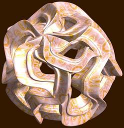 Keywords: mathematica 3d cg parametricplot3d texture torus 輪環 りんかん ドーナツ どーなつ 四芒星 しぼうせい 四光星 しこうせい 四稜星 しりょうせい code program algorithm コード プログラム アルゴリズム geometric sculpture geometricsculpture shape geometry sculpture mapping テクスチャ マッピング 模様 もよう abstract 抽象 ちゅうしょう アブストラクト design pattern デザイン パターン graphic グラフィック グラフィクス structure 意匠 構造 symmetry 対称性 たいしょうせい シンメトリー 対称 たいしょう algorithm コード indoor surreal black background a = 5; (* center hole size of a torus *) b = 4; (* tetra-torus *) c = 8; (* distance from the center of rotation *) d = 5; (* number of torus *) h = 1; (* height of a torus *) SetOptions[ParametricPlot3D, PlotRange -> Full, Mesh -> None, Boxed -> False, Axes -> False, PlotPoints -> 400, ImageSize -> 3000, Background -> Darker[Orange, 0.8], PlotStyle -> Directive[Specularity[White, 30], Texture[Import["D:/tmp/861.jpg"]]], TextureCoordinateFunction -> ({#4, #5 2 Pi} &), Lighting -> "Neutral"]; f[v_] := Sin[2 Sin[Sin[Sin[v]]]]; g[v_] := Sum[Cos[(2 k - 1) v]/(2 k - 1), {k, 4}]; x = (a - g[t] - f[b s]) Cos[s + 3 Pi/(4 b)] + c; y = (a - g[t] - f[b s]) Sin[s + 3 Pi/(4 b)] + c; z = (a - Sin[t] - h f[b s]); rot = Table[{x, y, z}.RotationMatrix[2 i Pi/d, {1, 1, 1}], {i, d}]; ParametricPlot3D[rot, {t, 0, 2 Pi}, {s, 0, 2 Pi}] (*--- The Texture *) a = 5; (* center hole size of a torus *) b = 4; (* tetra-torus *) c = 8; (* distance from the center of rotation *) d = 5; (* number of torus *) h = 1; (* height of a torus *) SetOptions[ParametricPlot3D, PlotRange -> Full, Mesh -> None, Boxed -> False, Axes -> False, PlotPoints -> 400, ImageSize -> 3000, Background -> Darker[Orange, 0.8], PlotStyle -> Directive[Specularity[White, 30], Texture[Import["D:/tmp/861.jpg"]]], TextureCoordinateFunction -> ({#4, #5 2 Pi} &), Lighting -> "Neutral"]; f[v_] := Sin[2 Sin[Sin[Sin[v]]]]; g[v_] := Sum[Cos[(2 k - 1) v]/(2 k - 1), {k, 4}]; x = (a - g[t] - f[b s]) Cos[s + 3 Pi/(4 b)] + c; y = (a - g[t] - f[b s]) Sin[s + 3 Pi/(4 b)] + c; z = (a - Sin[t] - h f[b s]); rot = Table[{x, y, z}.RotationMatrix[2 i Pi/d, {1, 1, 1}], {i, d}]; ParametricPlot3D[rot, {t, 0, 2 Pi}, {s, 0, 2 Pi}] (*--- The Texture *) |